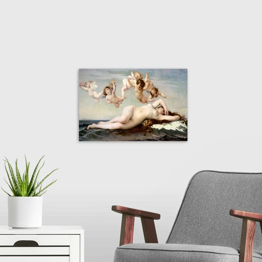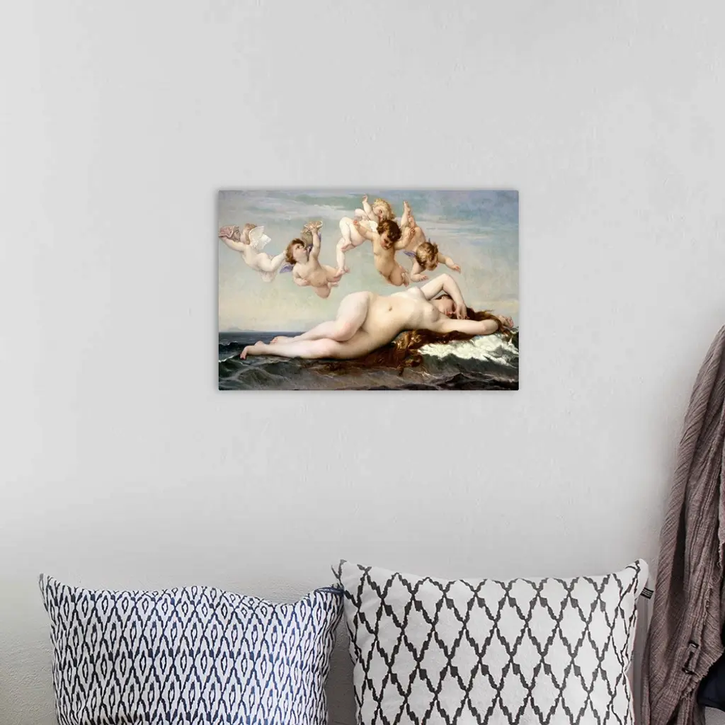 The first version of Cabanel's?Birth of Venus?(Musee d'Orsay, Paris) created a sensation at the Salon of 1863, which was dubbed the Salon of the Venuses owing to the number of alluring nudes on view. Embodying the ideals of academic art, the careful modeling, silky brushwork, and mythological subject of Cabanel's canvas proved a winning combination: the Salon picture was purchased by no less than Napoleon III for his personal collection. In 1875, John Wolfe commissioned the present, slightly smaller, replica from Cabanel.