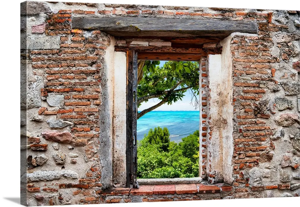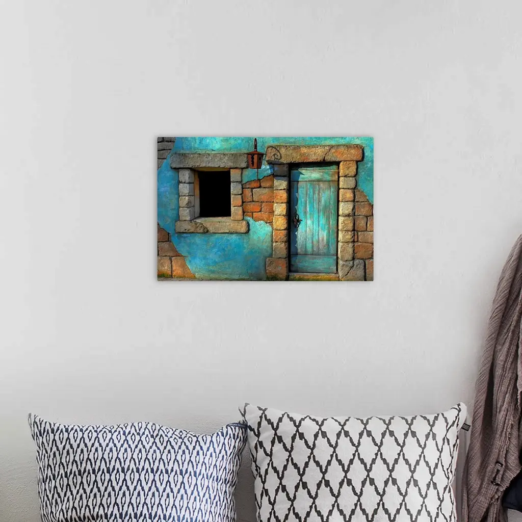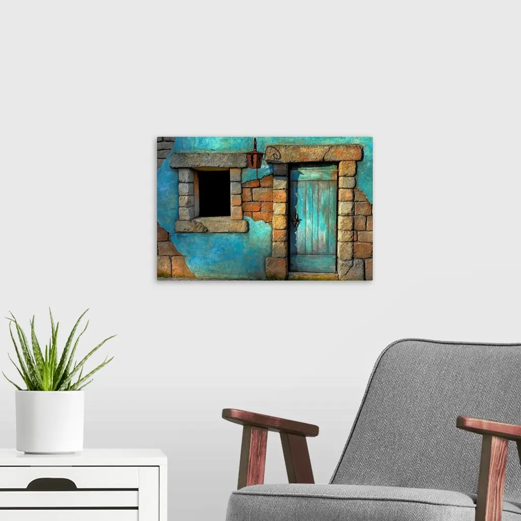 Landscape fine art photograph highlighting a door surrounded by a stone wall and window.
