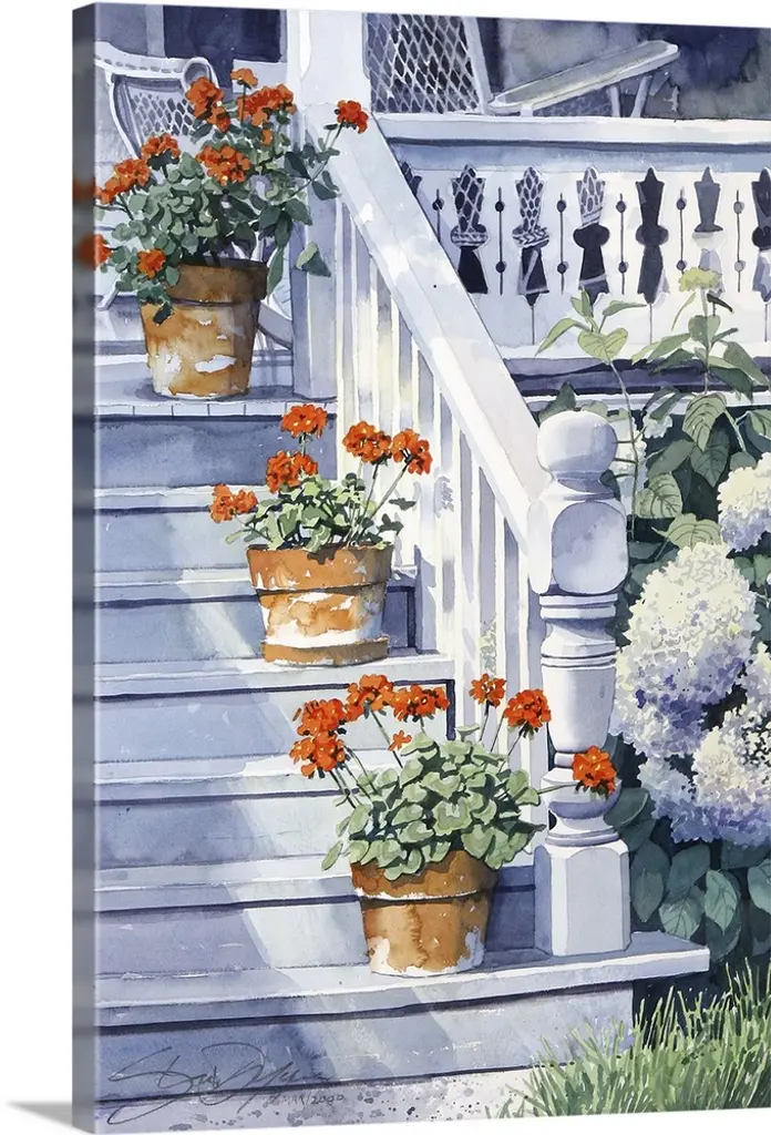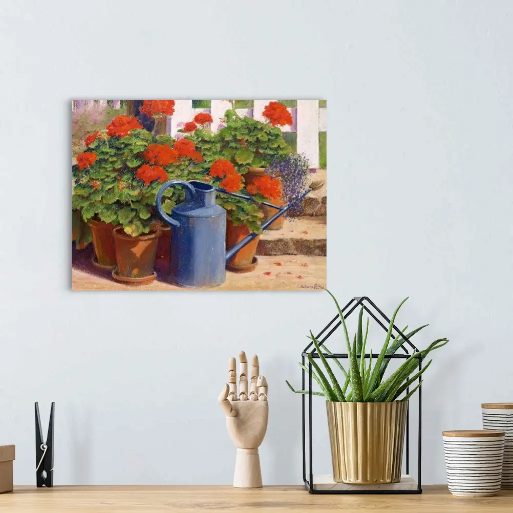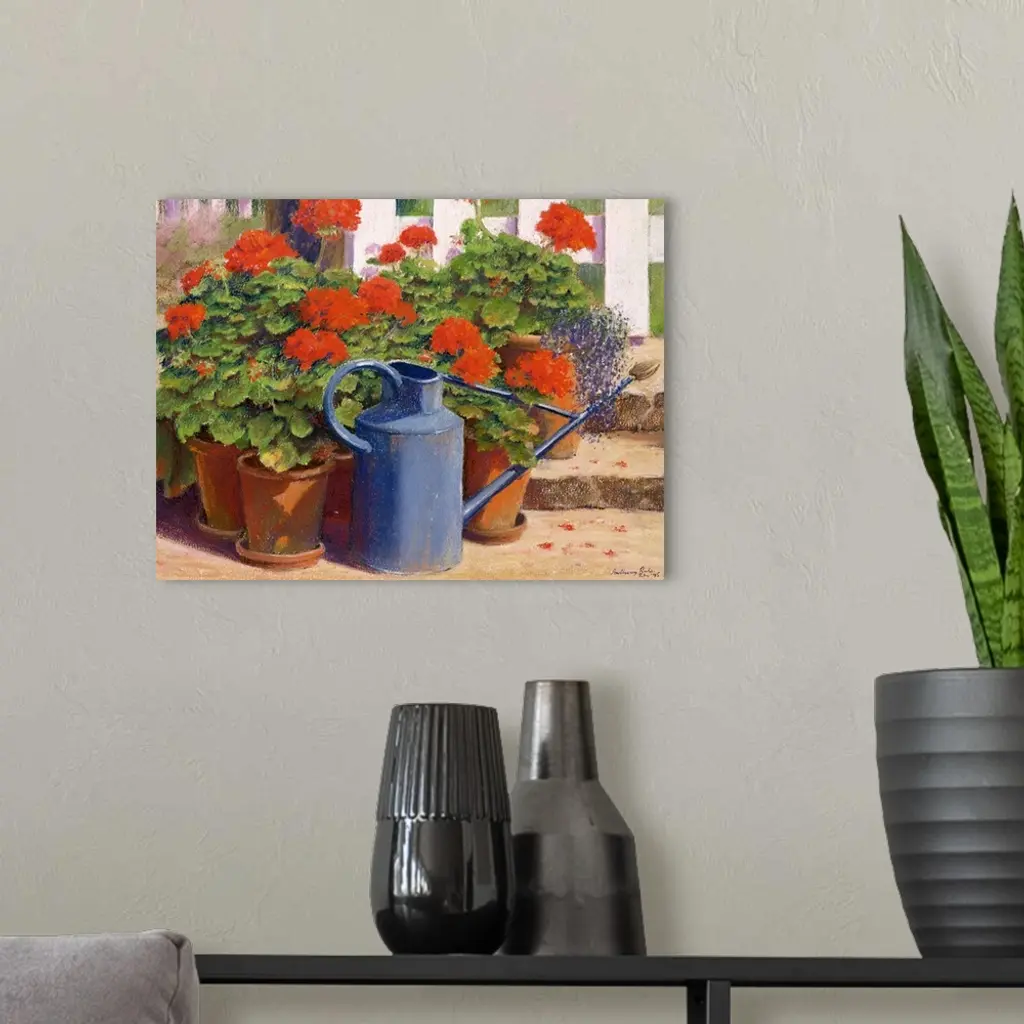Docor perfect for the home of painted potted flowers with a watering can in front.