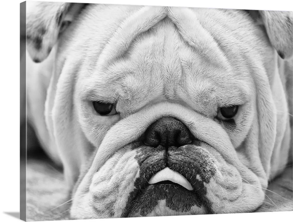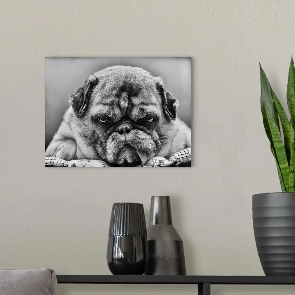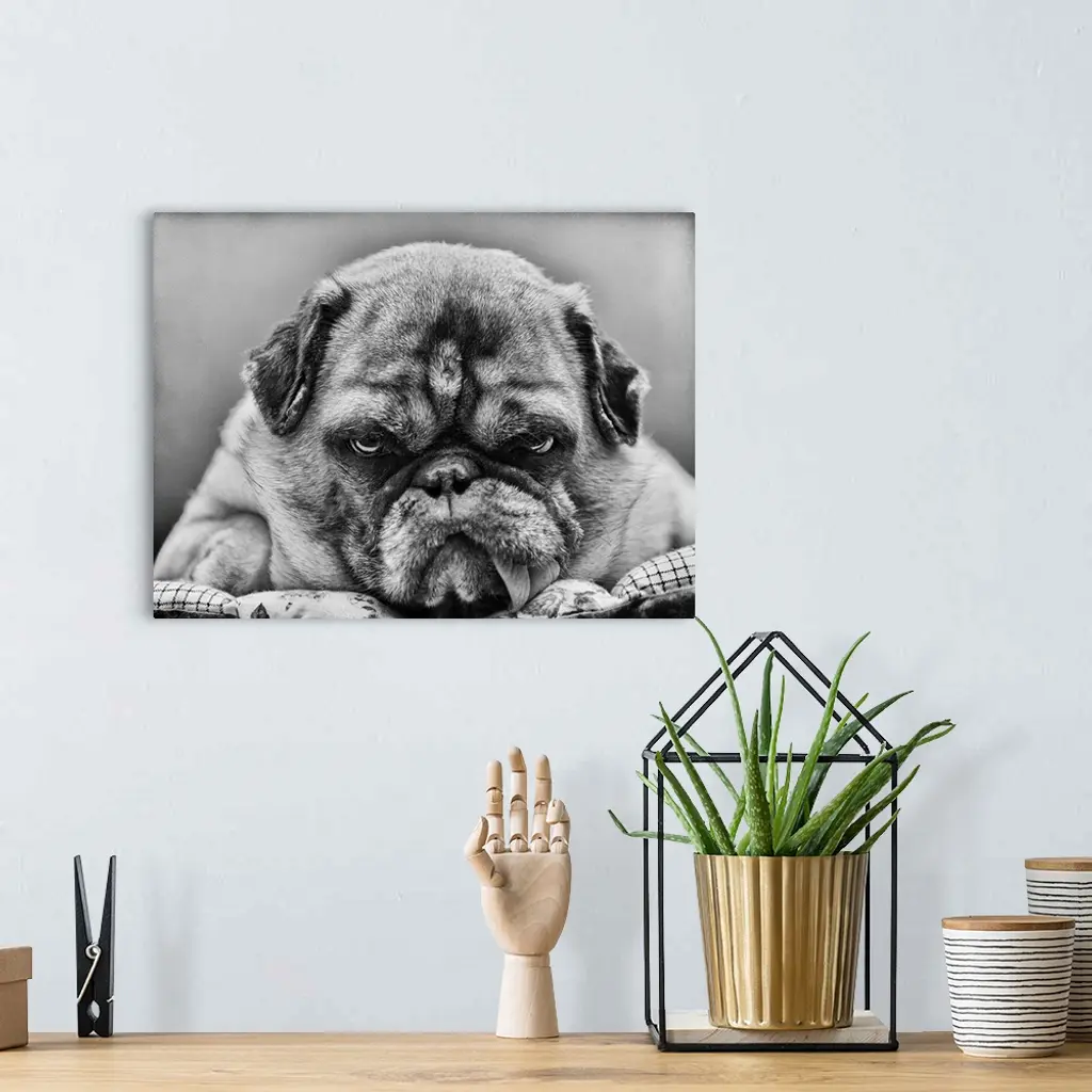 Grumpy-looking pug with tongue hanging out.
