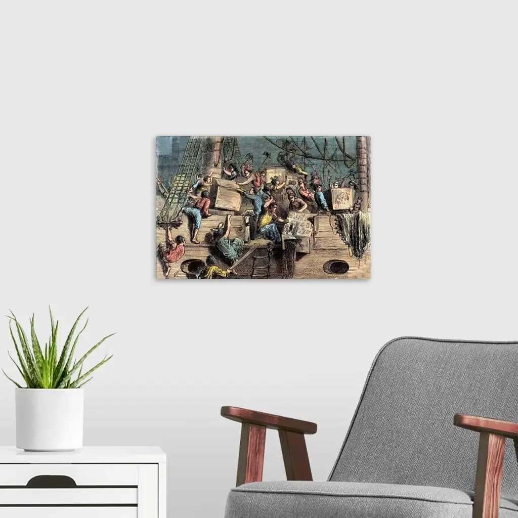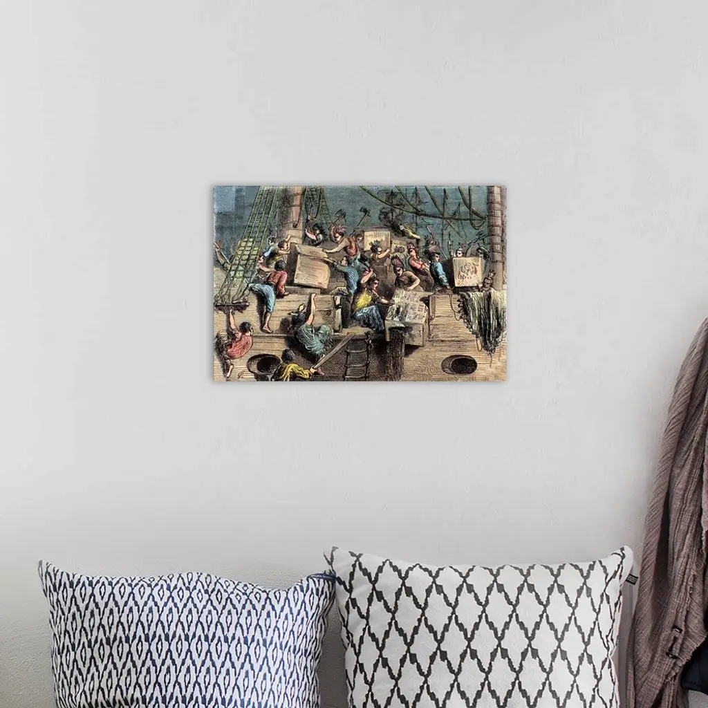 Colonists disguised as Mohawk Indians destroy chests of tea on ships in Boston Harbour as a protest against import duty tax.