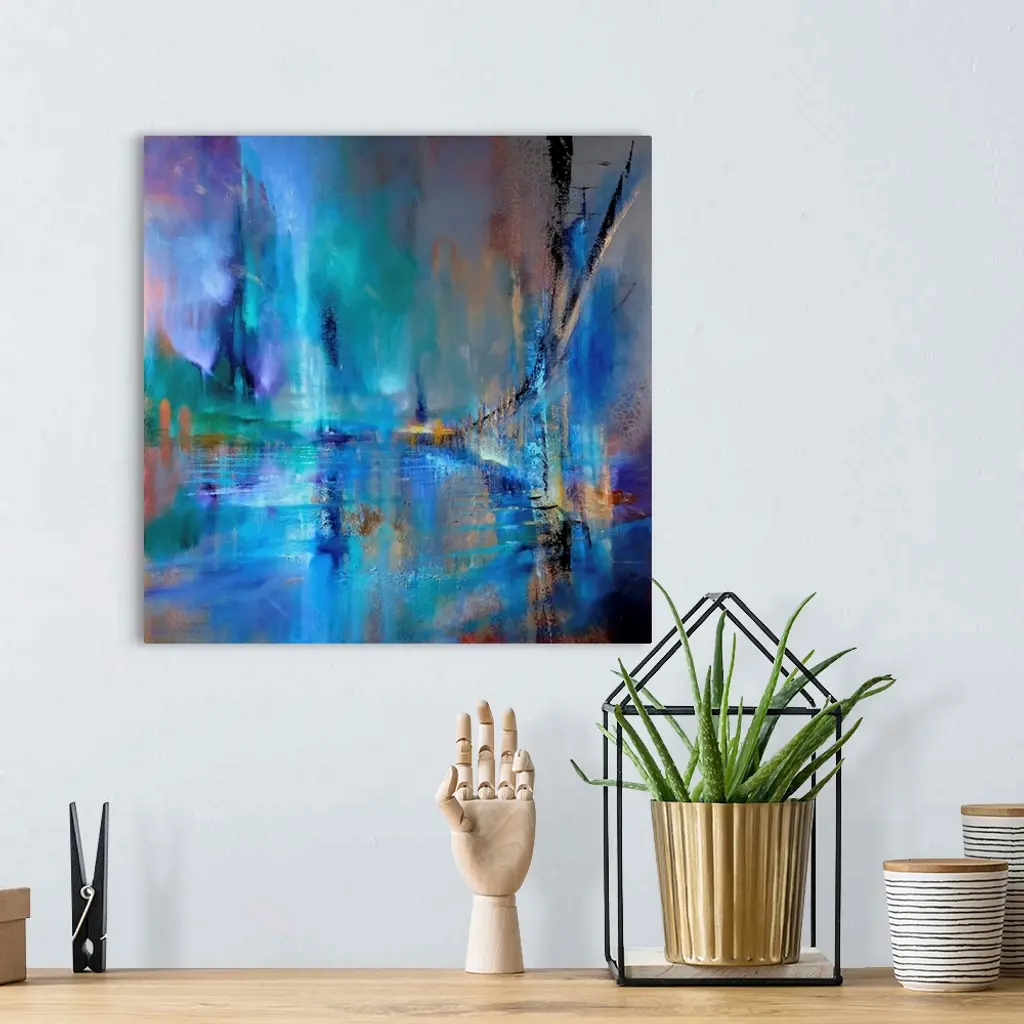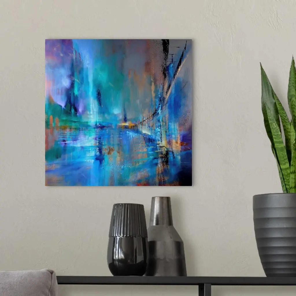 Abstractly painted cityscape in bright colors and structures: on the way on a suspension bridge, in the background a large, lively city with the silhouette of skyscrapers in red and blue. Reflection in the water.