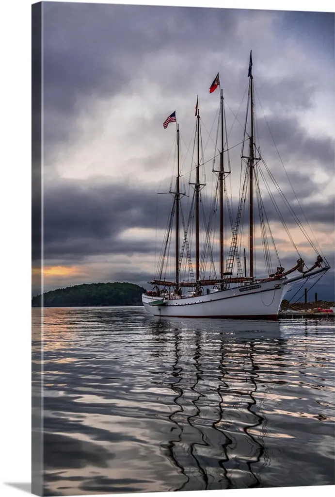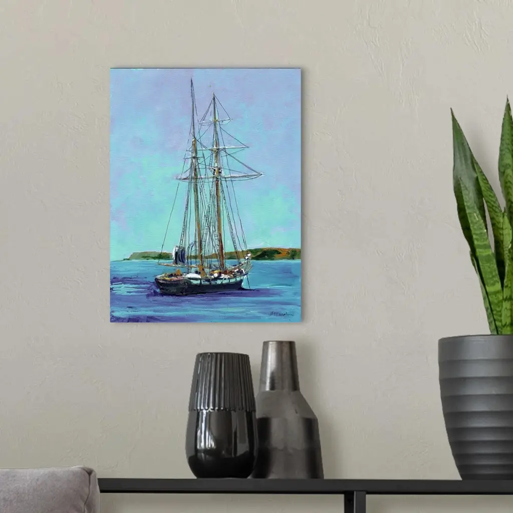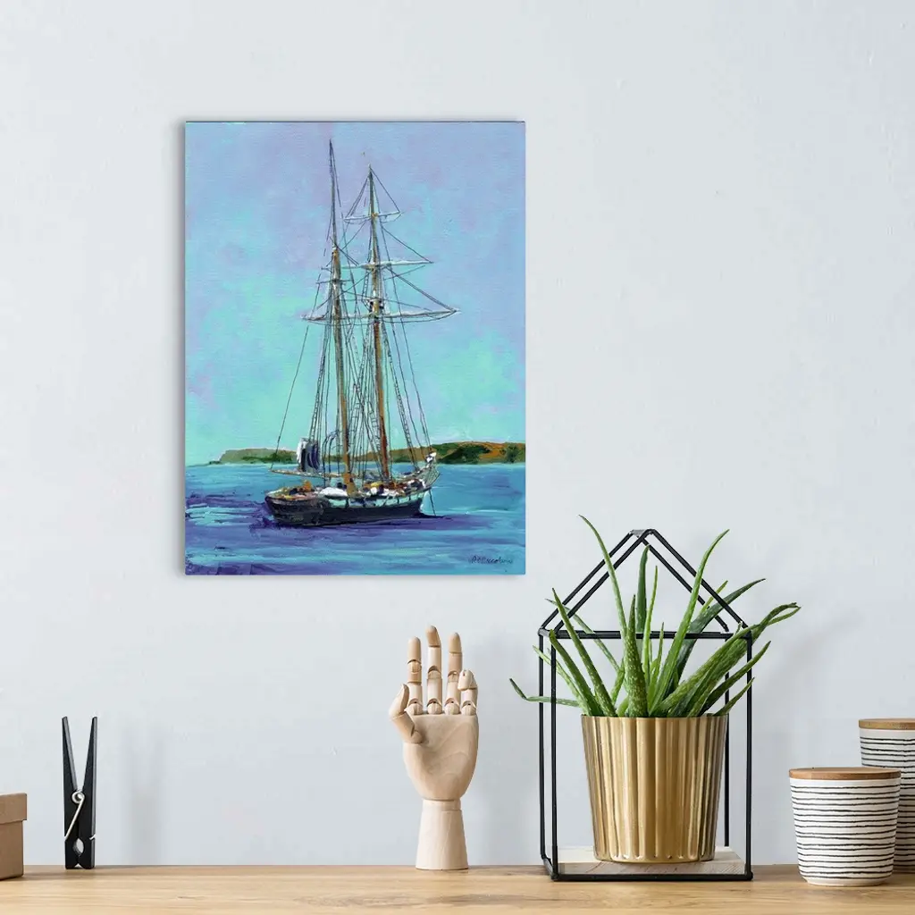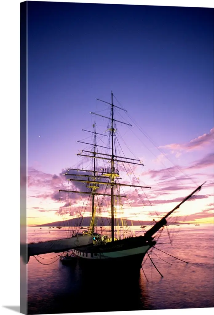The Californian - Tallship by RD Riccoboni- in San Diego Bay with Point Loma beyond. The Californian is a replica of the 1847 Revenue Cutter C.W. Lawrence, that patrolled the coast of California enforcing federal law during the gold rush. The Revenue Cutter Service, along with four other federal maritime agencies, was consolidated into the United States Coast Guard in 1915. Designed for speed, Californian has nine sails, carries 7,000 square feet of canvas, measures 145 feet in length, weighs 130 tons and is armed with four six-pound deck guns.