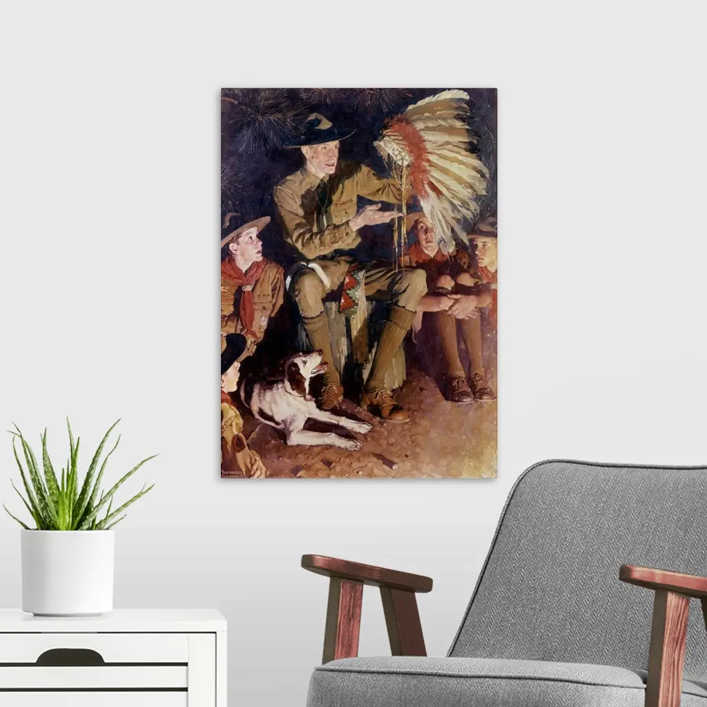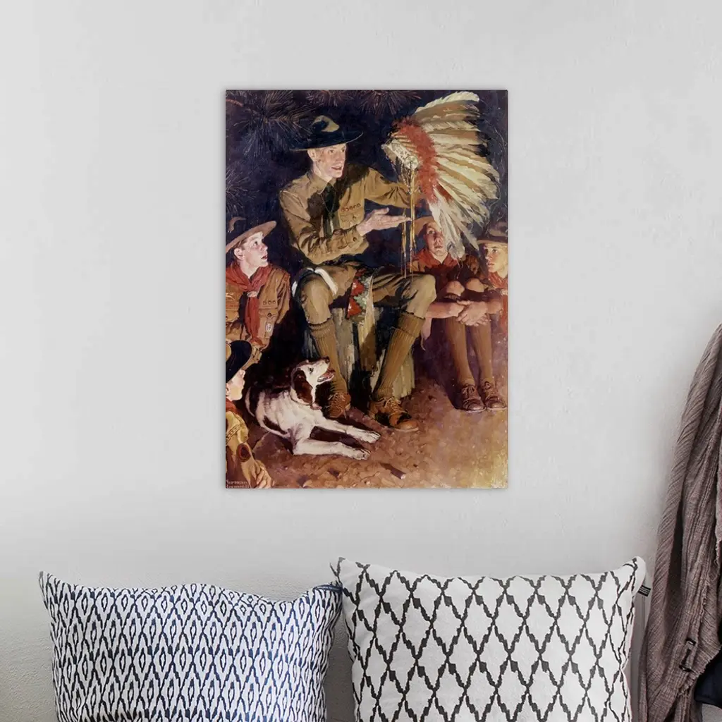 Norman Rockwells long artistic relationship with the Boy Scouts of America began after he successfully illustrated the Boy Scout Hikebook in the fall of 1912 and lasted until 1976 with Rockwell producing their annual calendar illustrations. Many of the images depict the Scouts learning, teaching, or doing outdoor activities. Approved by the Norman Rockwell Family Agency