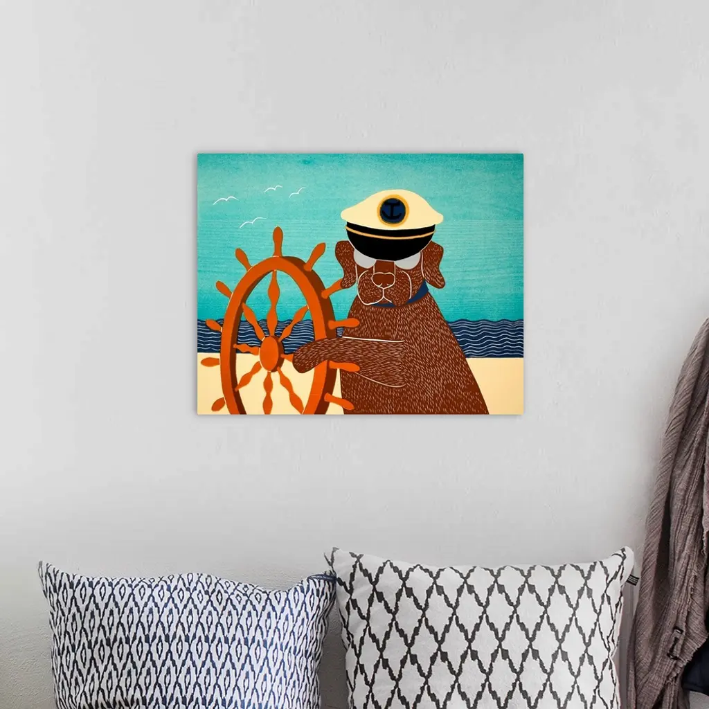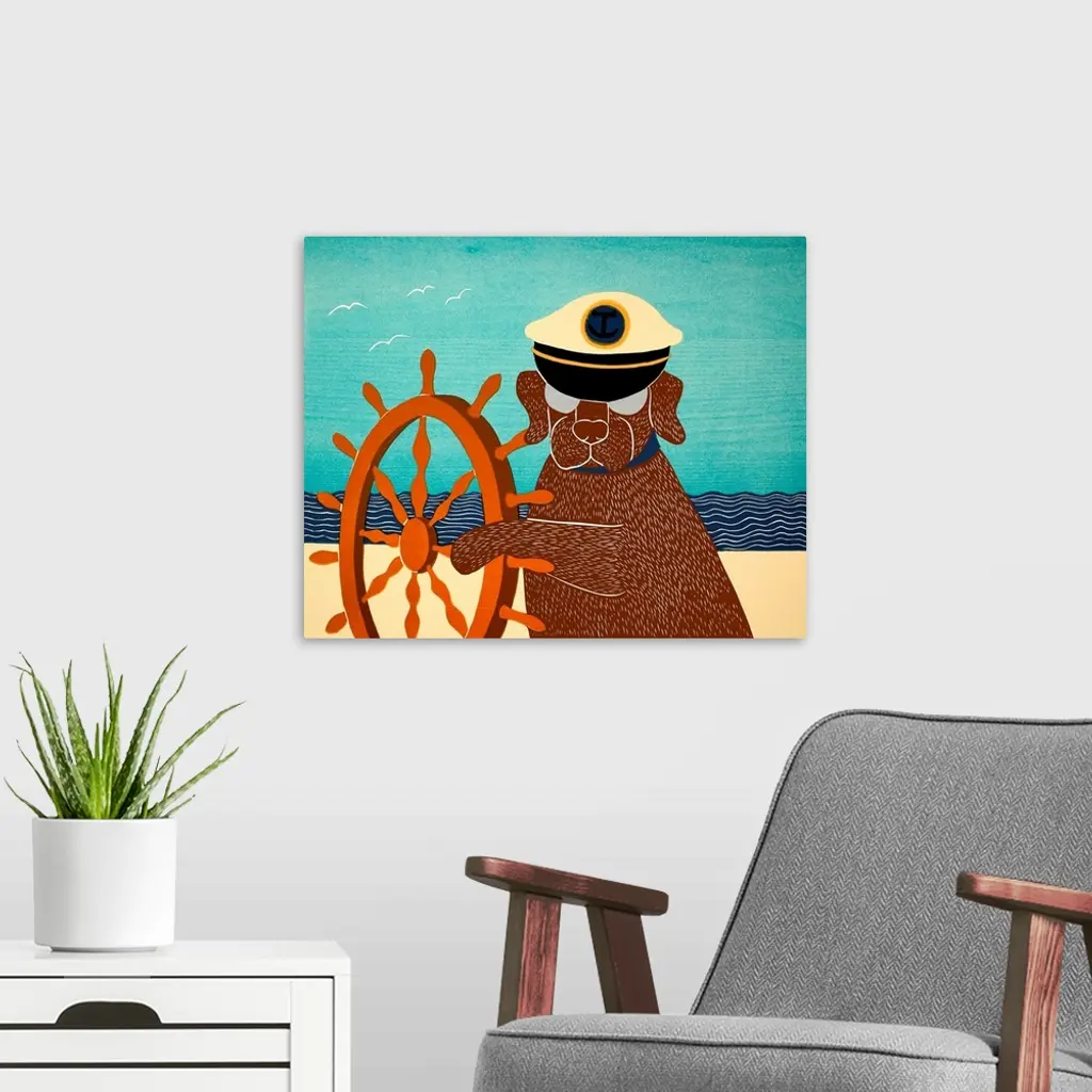 Illustration of a chocolate lab wearing a sailors hat and pawing a ship wheel on the beach.
