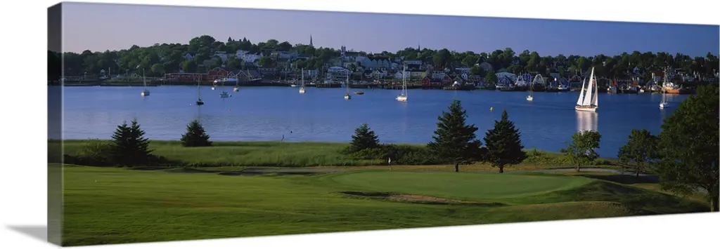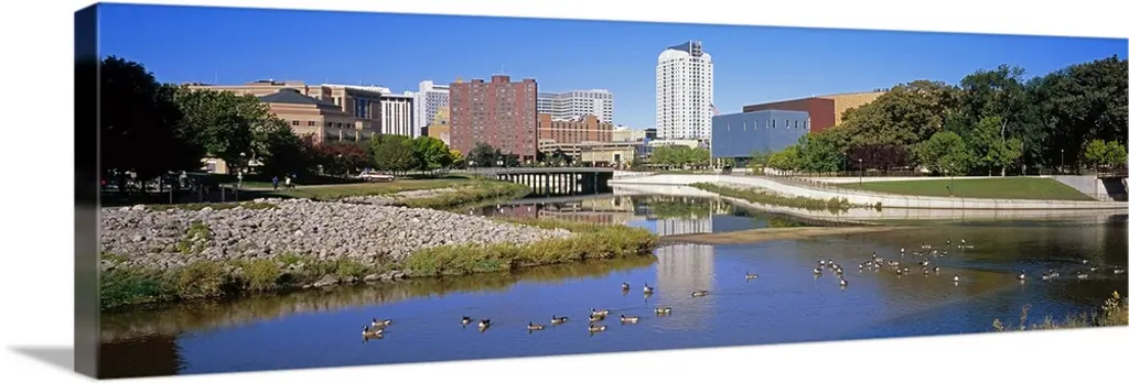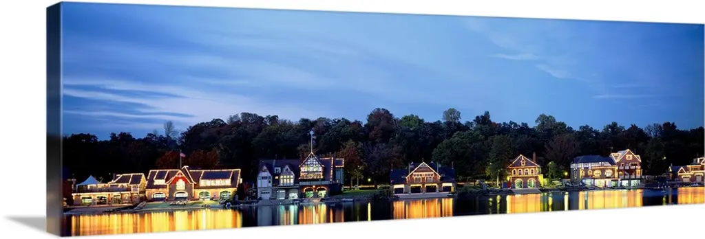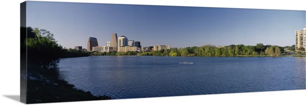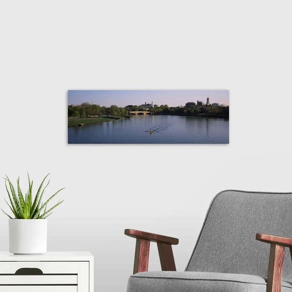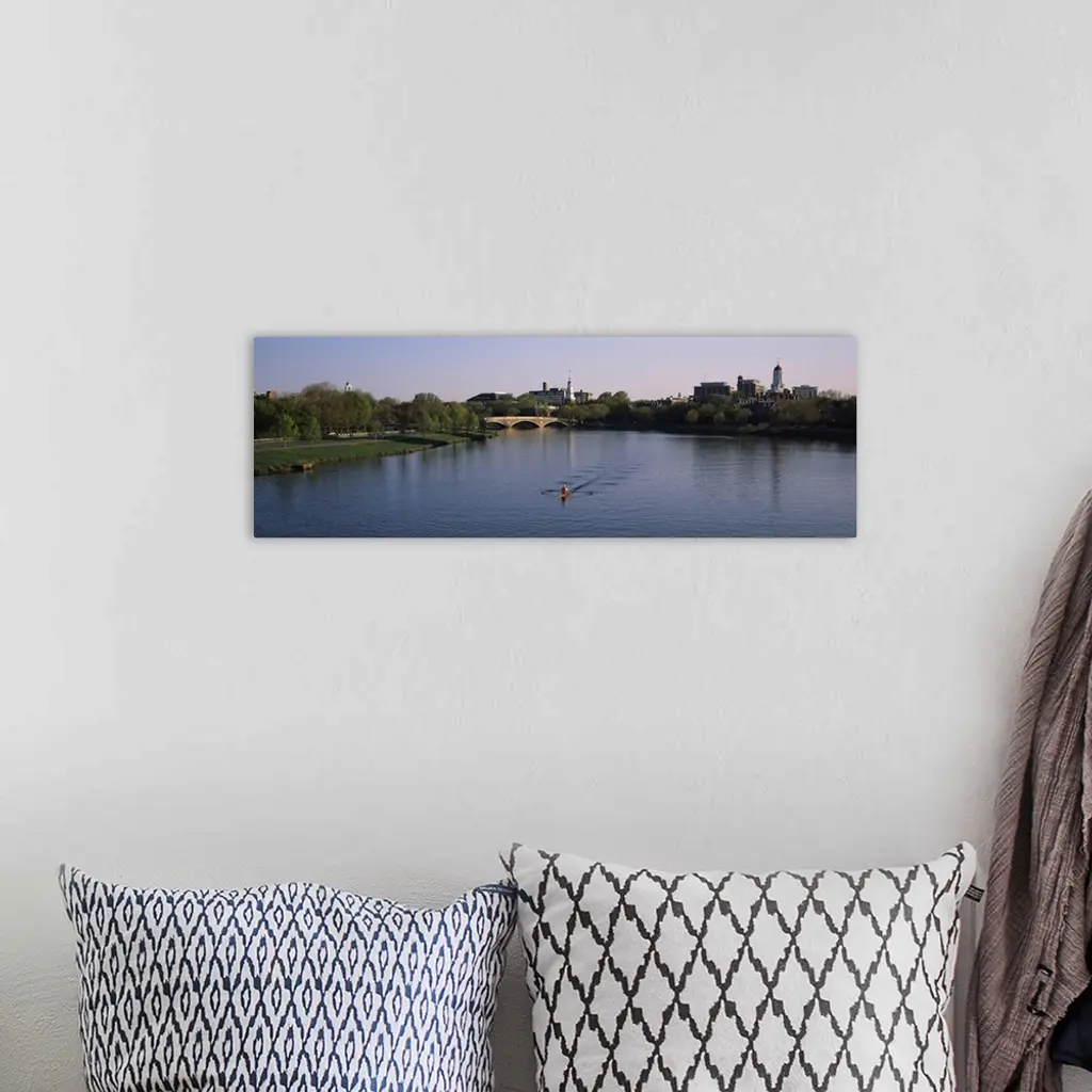 Panoramic photograph of rower in lake lined by trees with bridge in the distance under a clear sky.