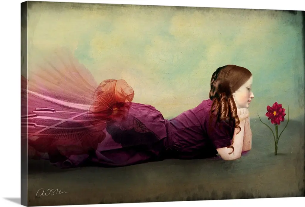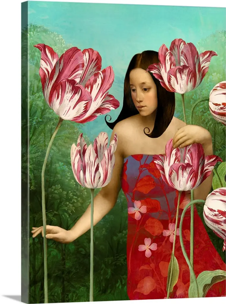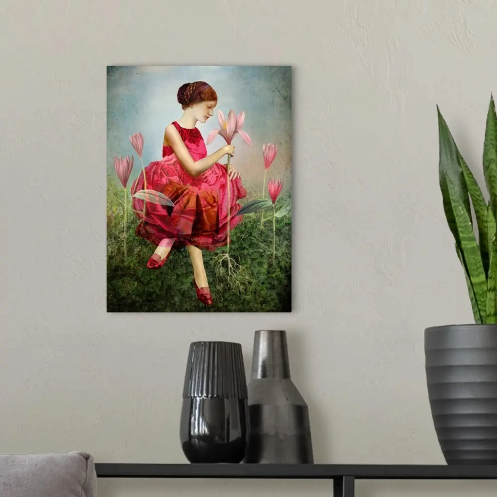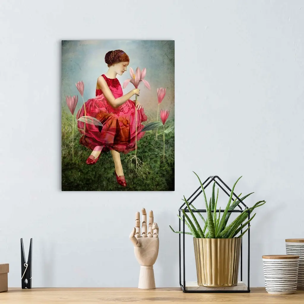 A lady with a rose dress in sitting in a field of flowers, picking the one that is in bloom.