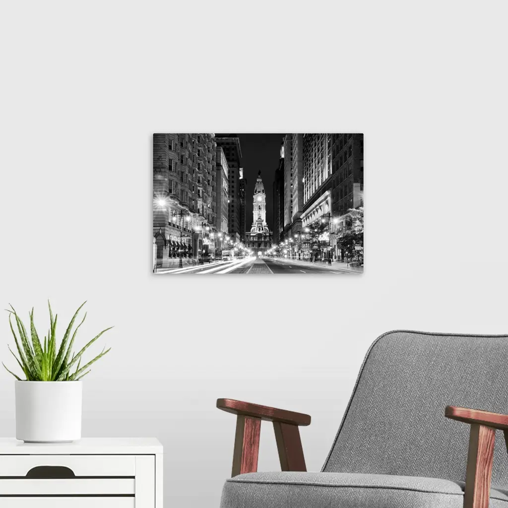 Fine art photograph of City Hall in Philadelphia in the evening, with light trails in the street.