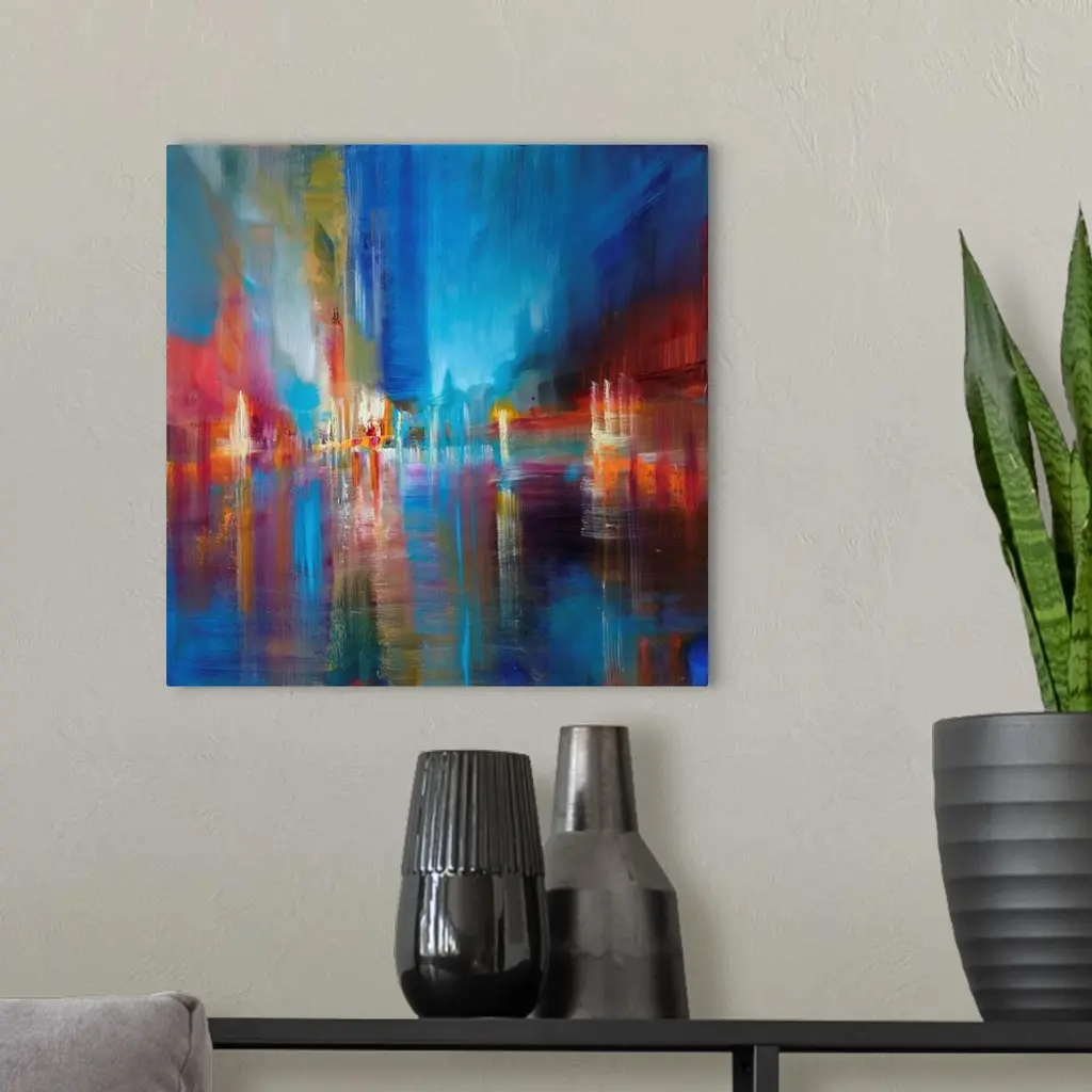 Abstractly painted cityscape in bright colors and structures: a large, lively city in red, orange and blue with the silhouette of skyscrapers. Reflection in the water.