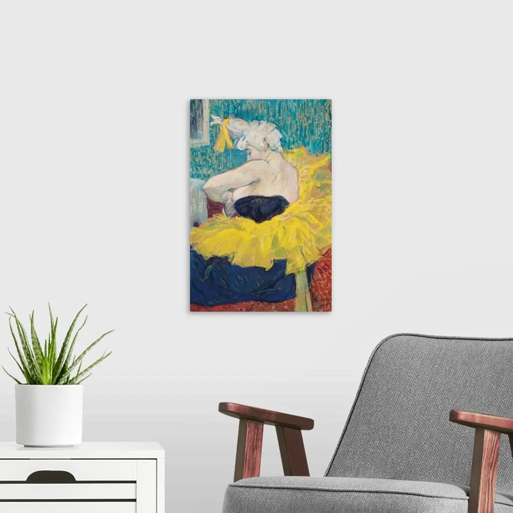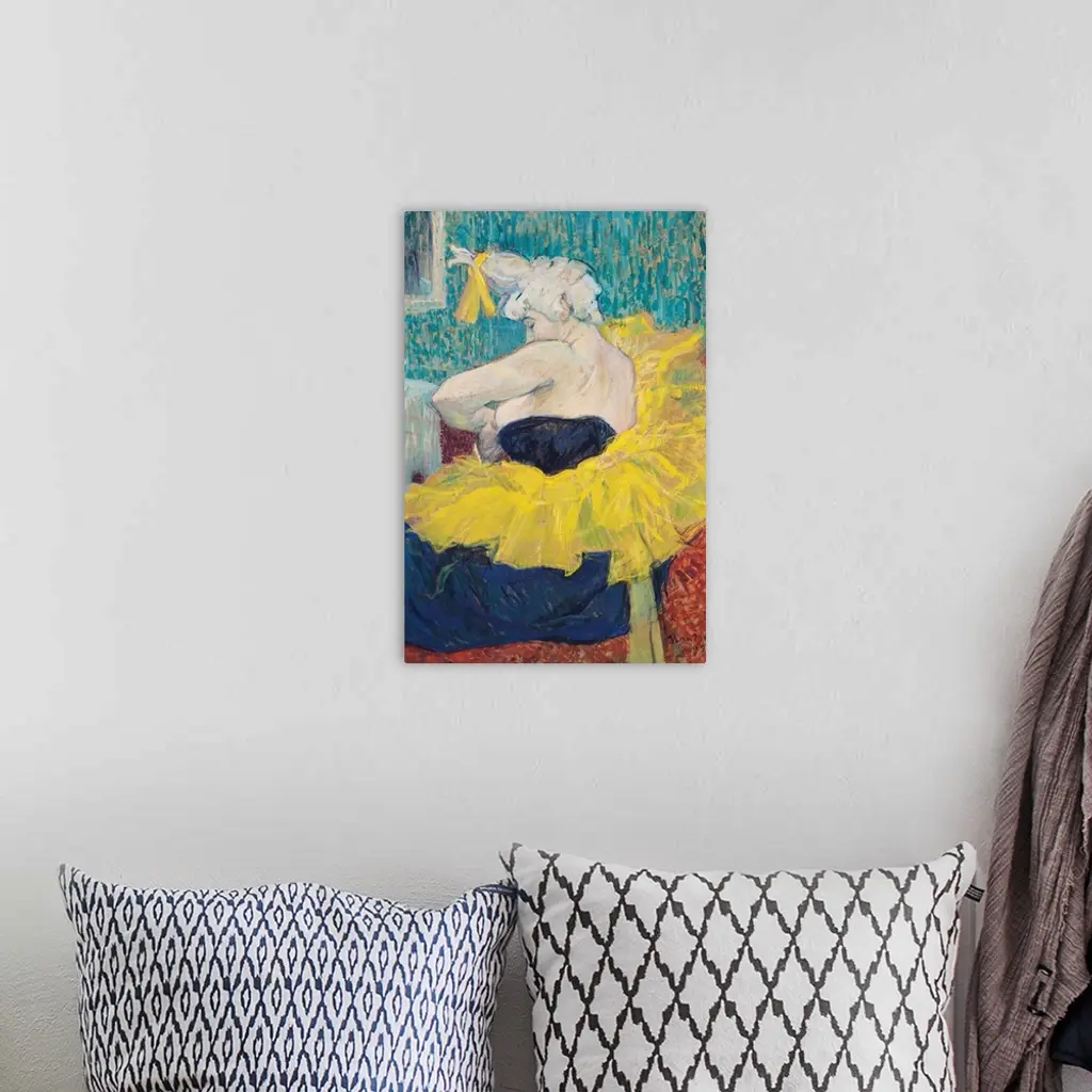 The portrait of a woman is drawn sitting wearing a blue dress with a yellow tutu wrapped around her upper body.