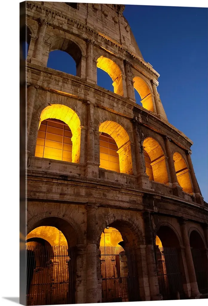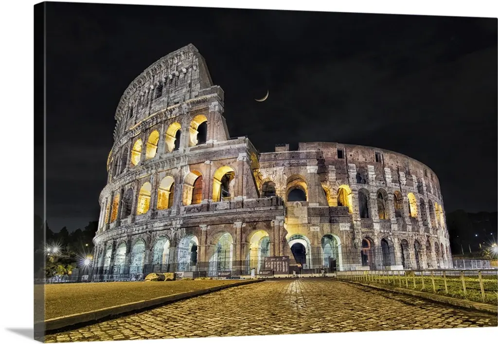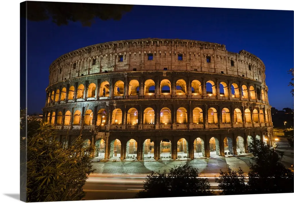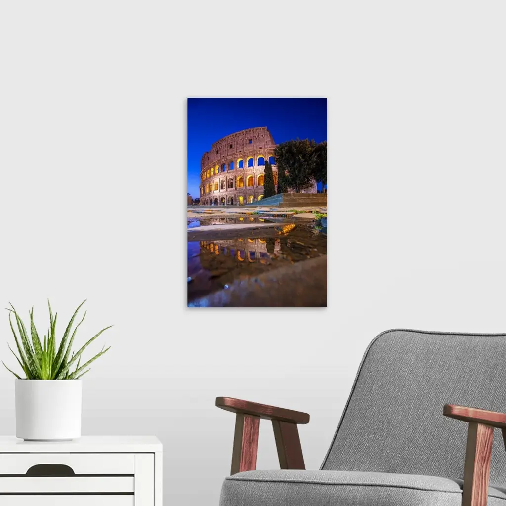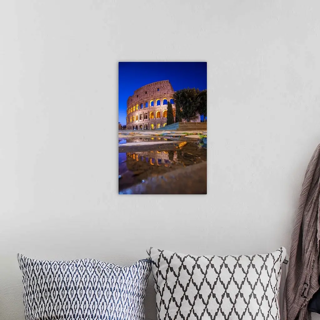 Photograph of the Colosseum at night reflecting into a puddle on the ground.