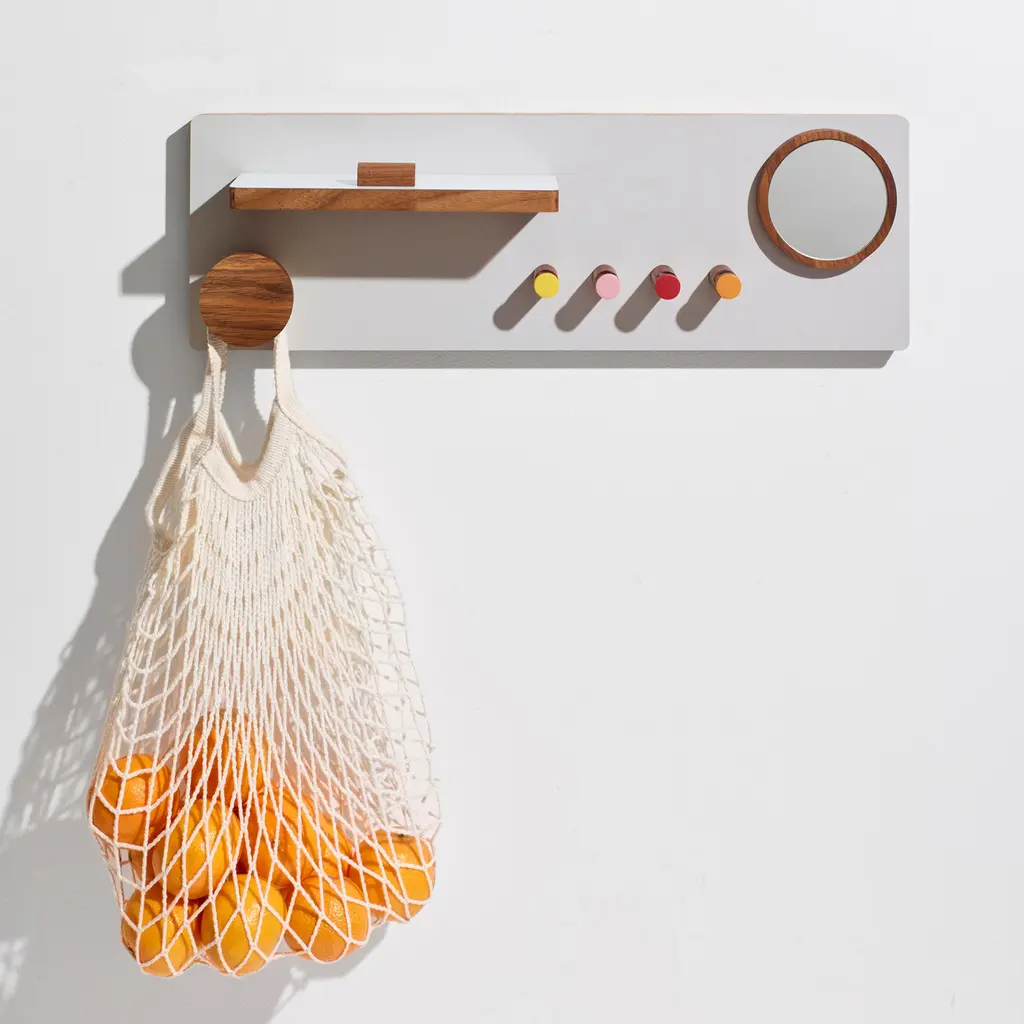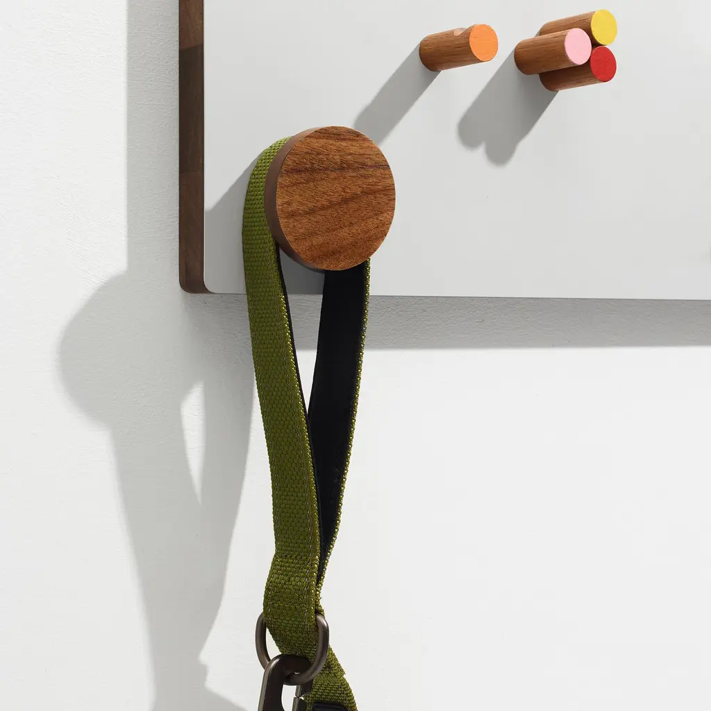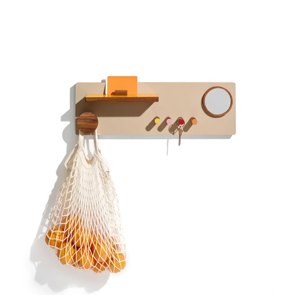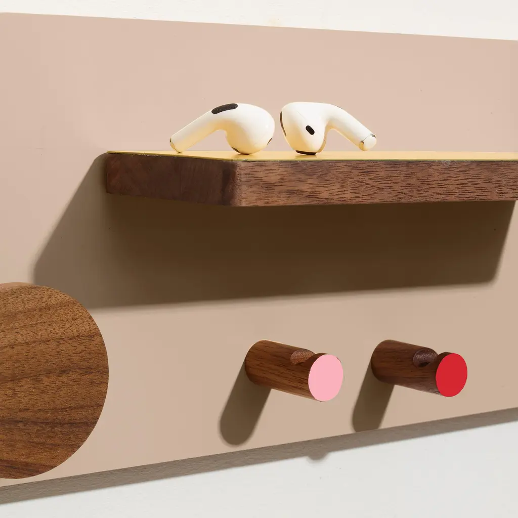 A 6 in × 18 in walnut panel turns less than 3 in of wall depth into a full entryway command center. Designed by Ilan Rubin, The Control Panel couples FSC-certified walnut with a powder-coated steel face in beige, gray, or red. Four magnetized pieces—two small hooks, one large hook, and a slim shelf with stopper—slide anywhere along the metal surface to catch keys, mail, earbuds, or a favorite hat. A fifth, fixed hook at the base handles weightier gear like backpacks or market totes, while a round magnetic mirror pops on and off for last-second checks. The ultra-slim profile keeps tight foyers and apartment corridors feeling open; mount it at eye level and walk in with both hands full, snapping items into place without thinking. Need more capacity? Add extra Ilan magnetic hooks or swap the shelf position in seconds—no tools, no new holes in the wall. From dog leashes to transit cards, every daily essential finds a designated spot, and the warm walnut grain brings a quiet design note to the first thing you see when you come home.