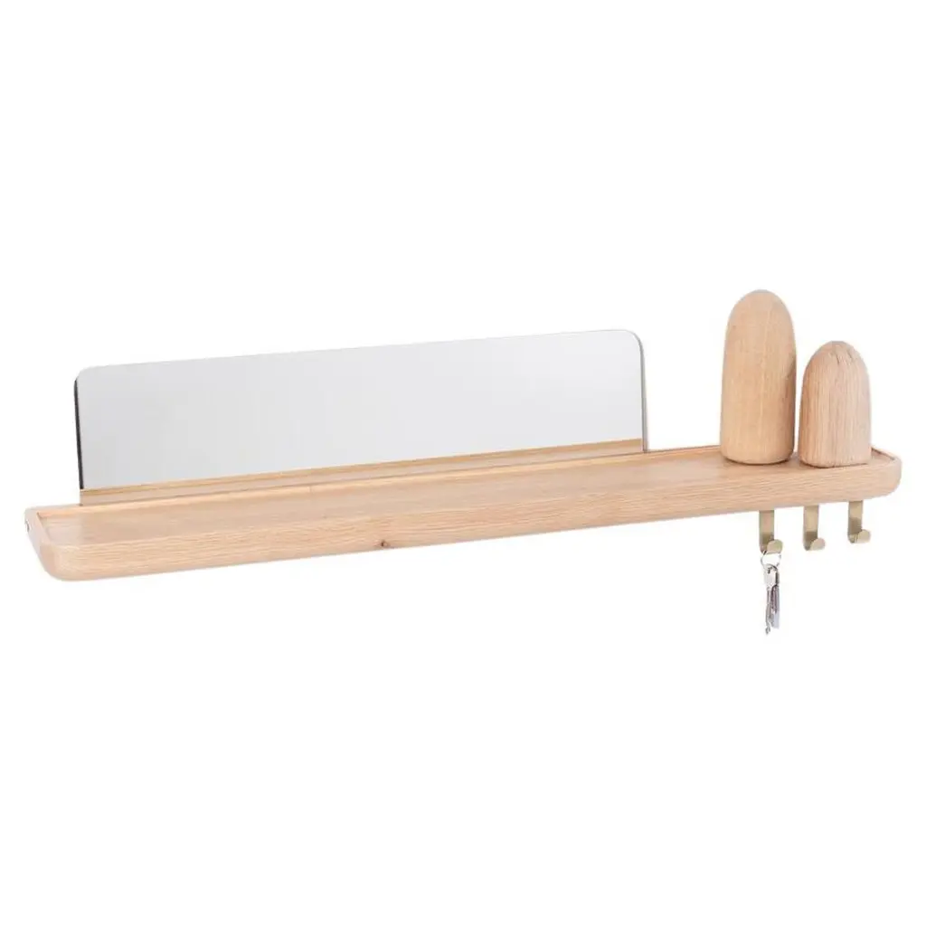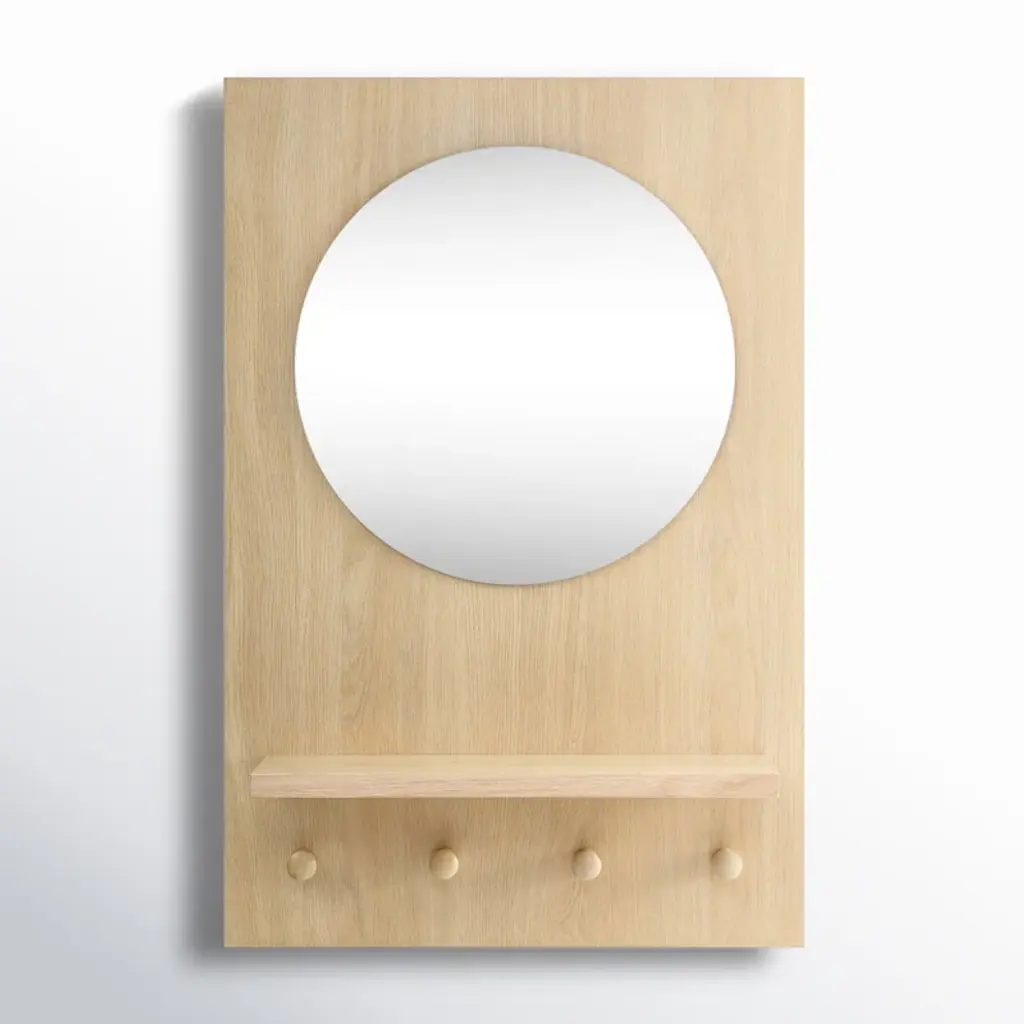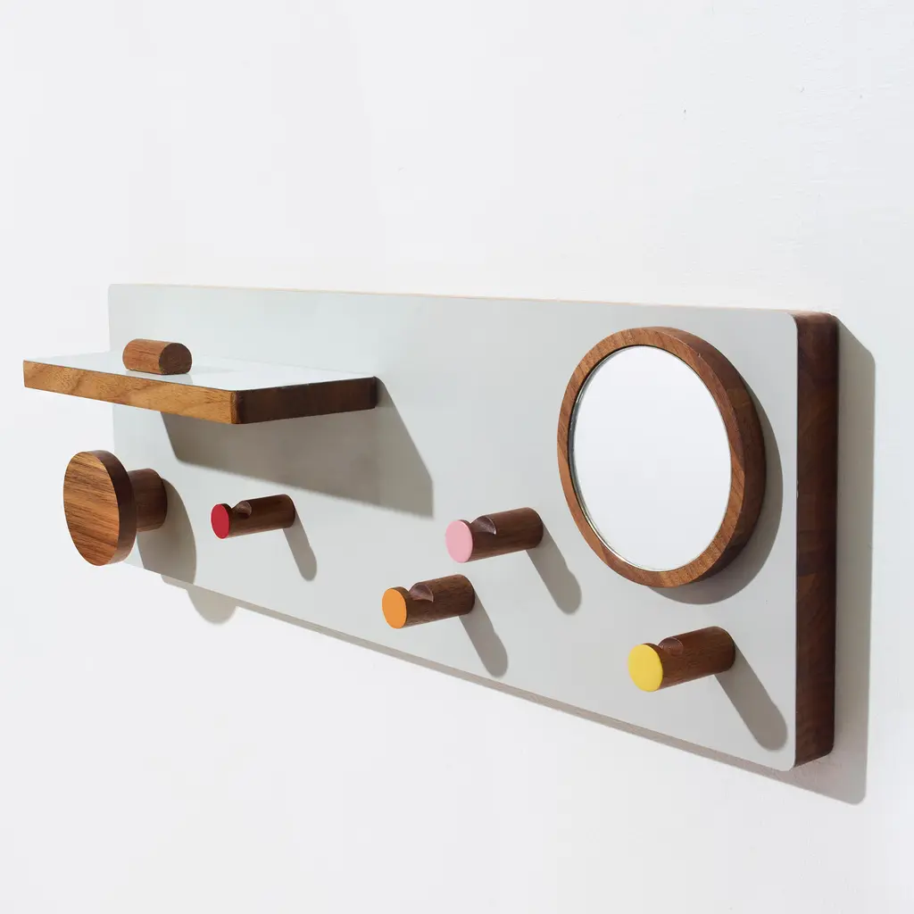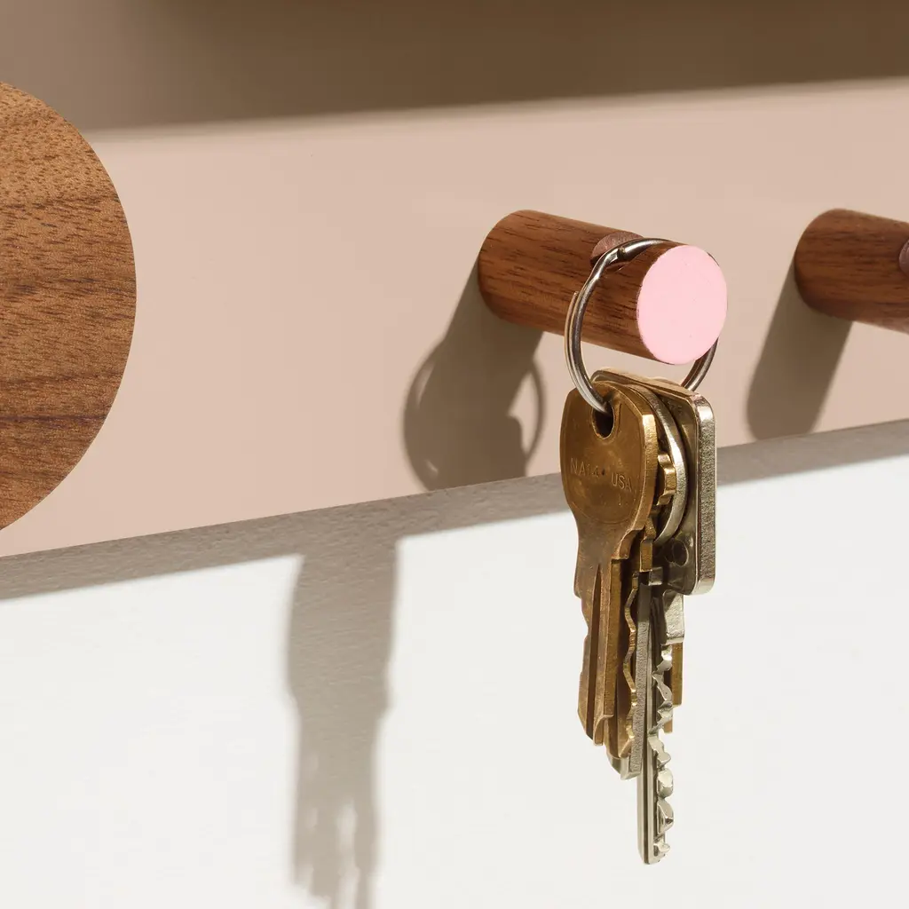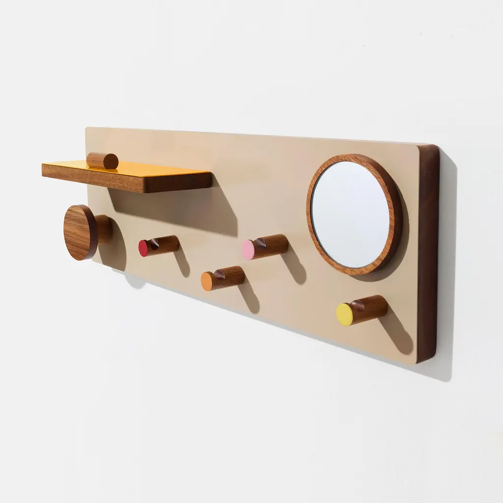 A 6 in × 18 in walnut panel turns less than 3 in of wall depth into a full entryway command center. Designed by Ilan Rubin, The Control Panel couples FSC-certified walnut with a powder-coated steel face in beige, gray, or red. Four magnetized pieces—two small hooks, one large hook, and a slim shelf with stopper—slide anywhere along the metal surface to catch keys, mail, earbuds, or a favorite hat. A fifth, fixed hook at the base handles weightier gear like backpacks or market totes, while a round magnetic mirror pops on and off for last-second checks. The ultra-slim profile keeps tight foyers and apartment corridors feeling open; mount it at eye level and walk in with both hands full, snapping items into place without thinking. Need more capacity? Add extra Ilan magnetic hooks or swap the shelf position in seconds—no tools, no new holes in the wall. From dog leashes to transit cards, every daily essential finds a designated spot, and the warm walnut grain brings a quiet design note to the first thing you see when you come home.