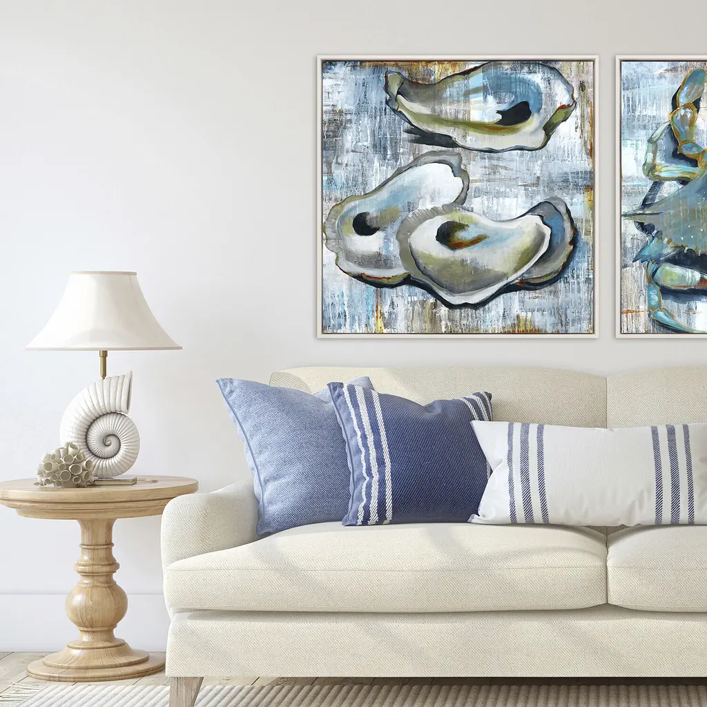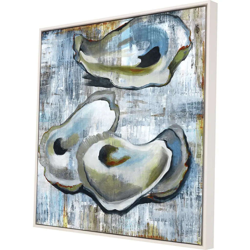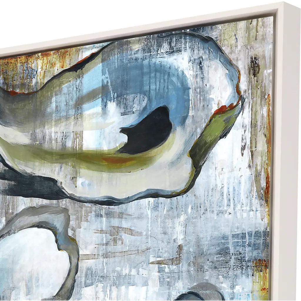 Oyster shells rest on a varied backdrop of blue and white. Canvas is mounted in a matte white wood floater frame.