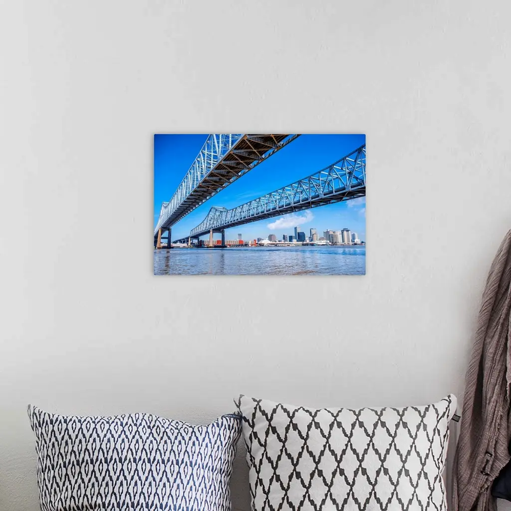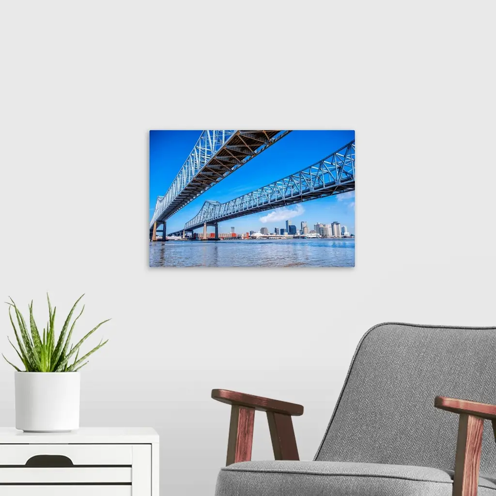 Photograph of the Crescent City Connection, formerly the Greater New Orleans Bridge, twin cantilever bridges that carry U.S. Highway 90 Business over the Mississippi River in New Orleans, Louisiana, with the New Orleans skyline in the distance.