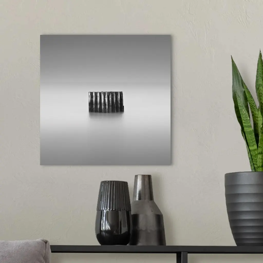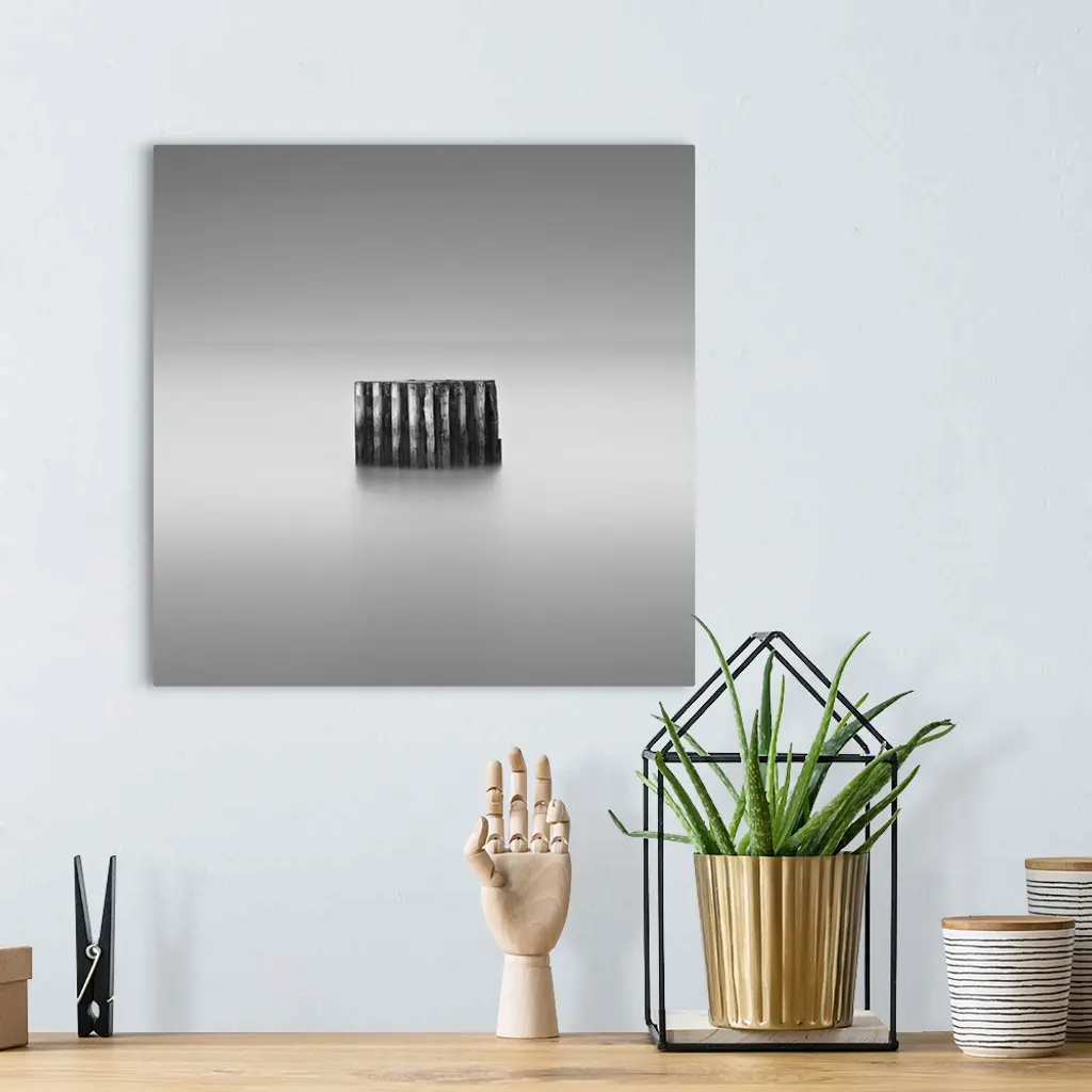 A zen minimalist calm monochrome black and white seascape with flat water and a cloudless sky showing a square harbour installation.