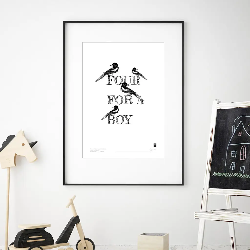 The perfect gift for a newborn. This A3 illustration brings the captivating 'Magpie Rhyme' to life. As you explore the illustration, you will discover six hidden gems carefully concealed within each Magpie. These gems add an extra layer of intrigue and delight, encouraging viewers to look closer and uncover the hidden treasures.What can you see?Hint:[ Peacocks | Ducks | Geese | Crows ]NB: You may not see the hidden gems today. Your perception is constantly evolving. Come back to it later, they may appear then.Limited 1st Edition of 100.