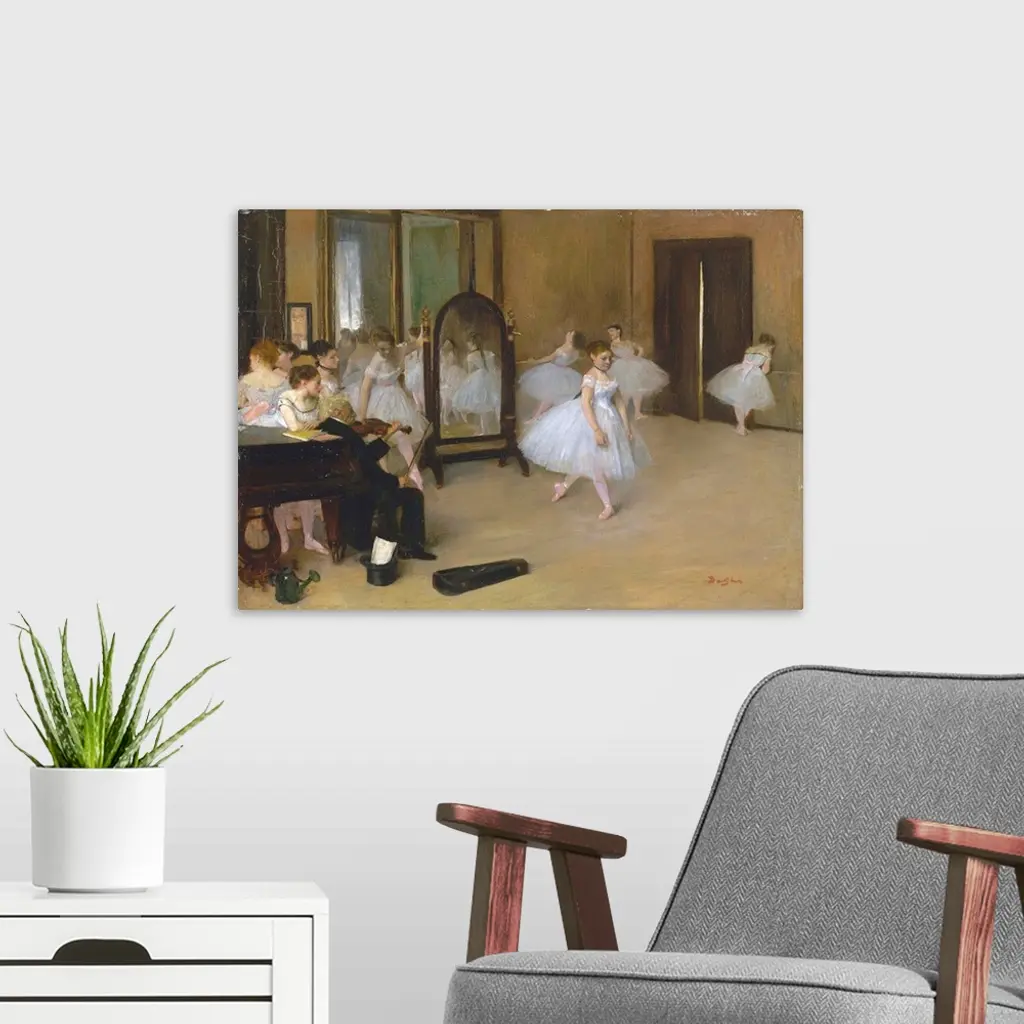 This is Degas's first depiction of a dance class. Because the artist did not yet have privileges to go backstage at the Paris Opera, his subjects came to his studio to pose. These sessions yielded many large study drawings, which Degas subsequently adapted for other compositions. In the late 1870s, he explained, I have painted so many of these dance examinations without having seen them that I am a little ashamed of it.
