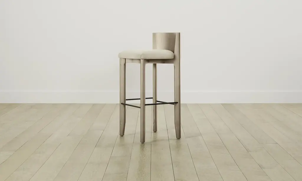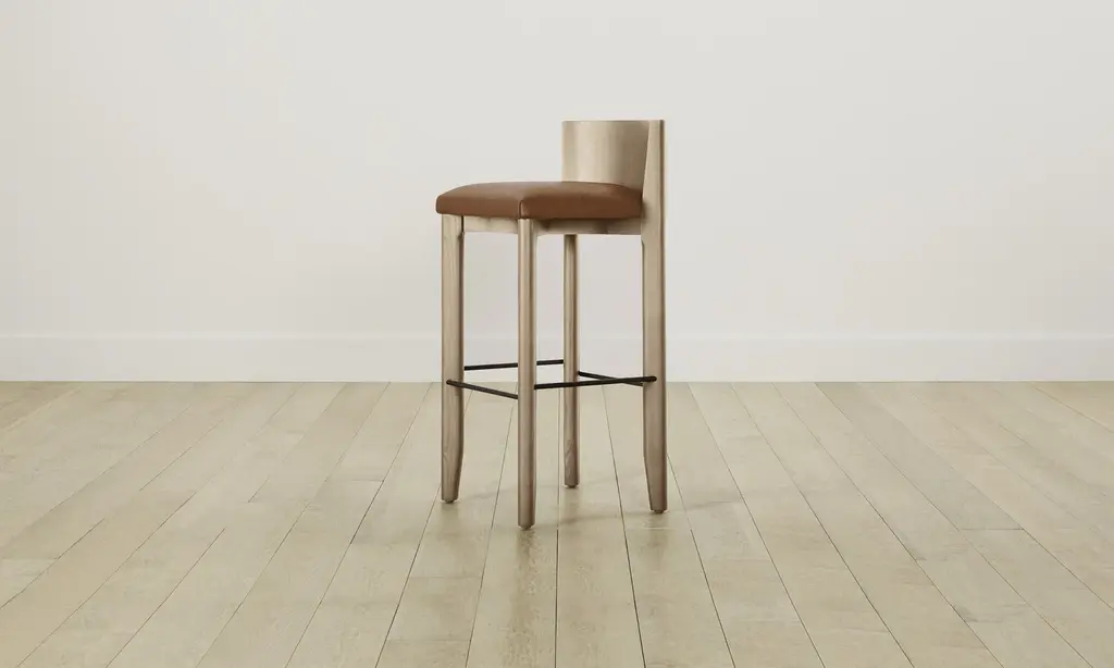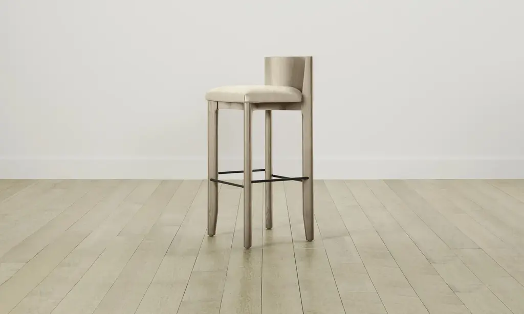 The Delancey Bar & Counter Stool brings depth and dimension into your space with its mixed materiality. Made from ash, it has an elegantly curved back, upholstered seat, and metal footrest. Handcrafted in North Carolina.
