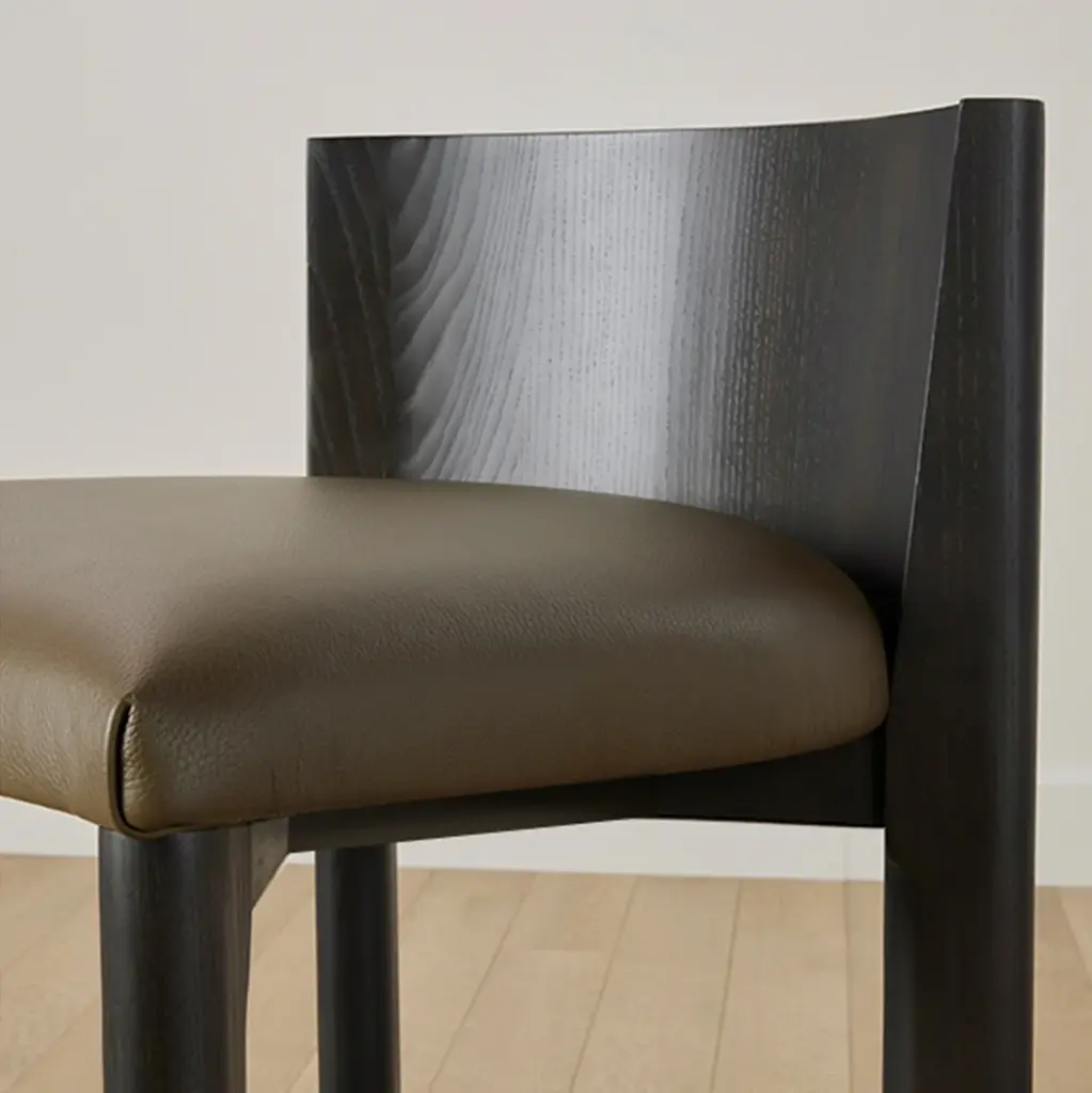 The Delancey Bar & Counter Stool brings depth and dimension into your space with its mixed materiality. Made from ash, it has an elegantly curved back, upholstered seat, and metal footrest. Handcrafted in North Carolina.