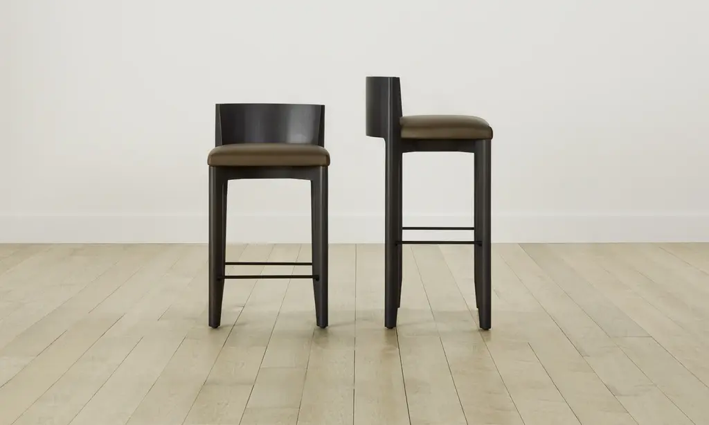 The Delancey Bar & Counter Stool brings depth and dimension into your space with its mixed materiality. Made from ash, it has an elegantly curved back, upholstered seat, and metal footrest. Handcrafted in North Carolina.