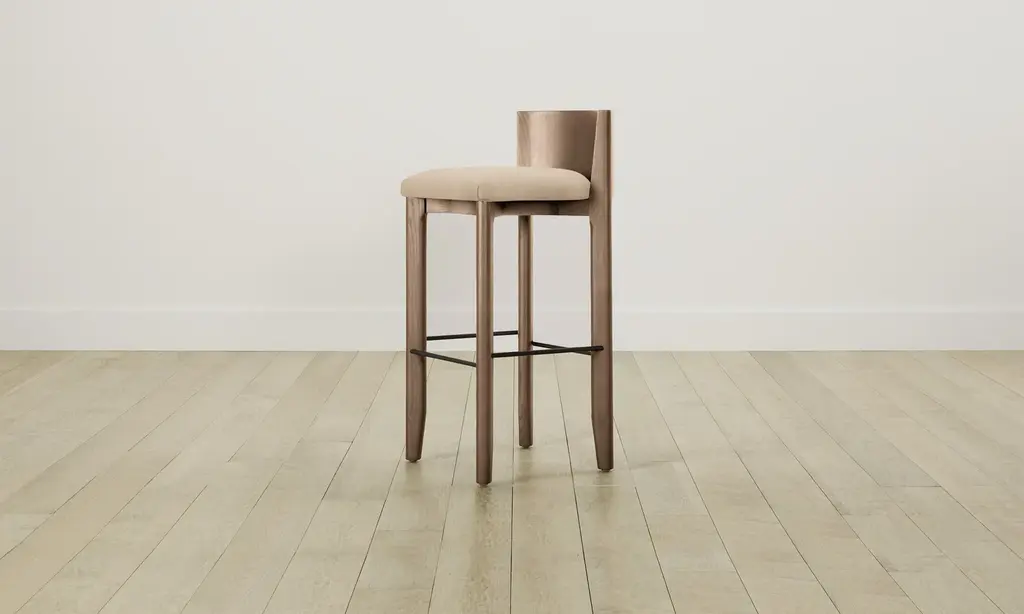 The Delancey Bar & Counter Stool brings depth and dimension into your space with its mixed materiality. Made from ash, it has an elegantly curved back, upholstered seat, and metal footrest. Handcrafted in North Carolina.