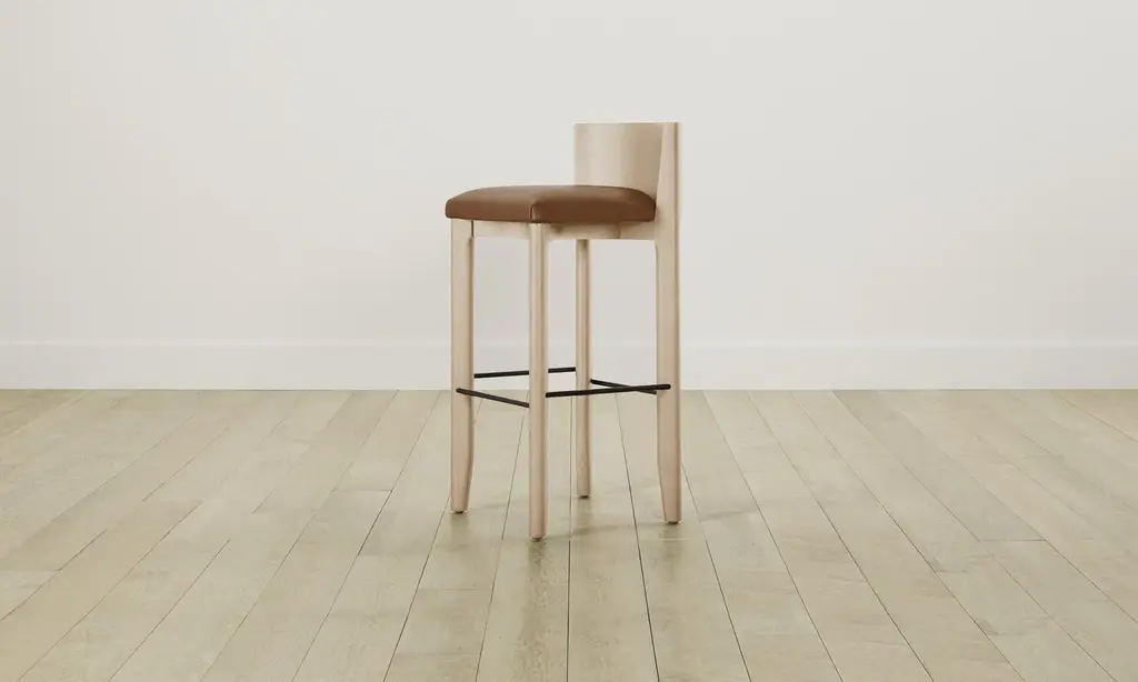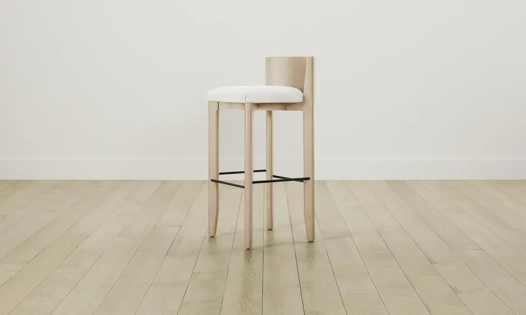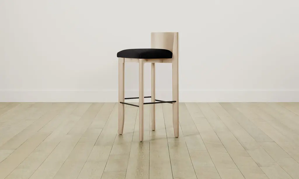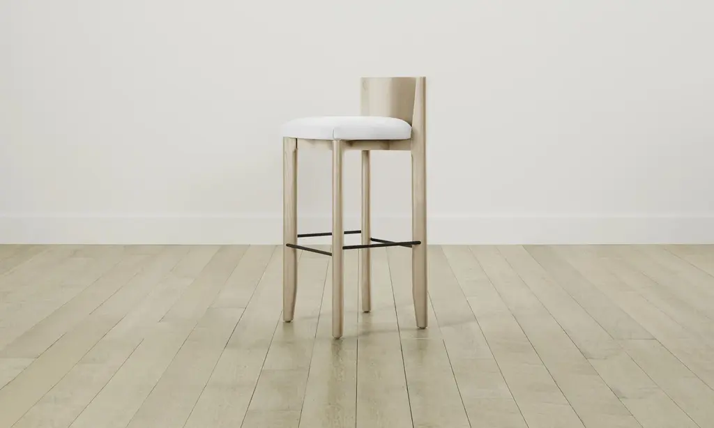 The Delancey Bar & Counter Stool brings depth and dimension into your space with its mixed materiality. Made from ash, it has an elegantly curved back, upholstered seat, and metal footrest. Handcrafted in North Carolina.
