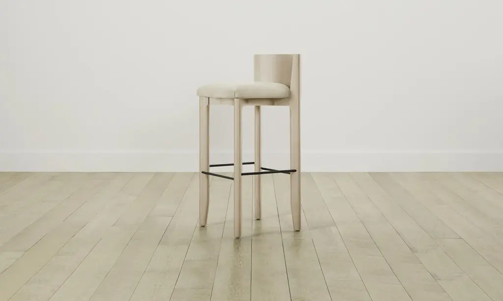 The Delancey Bar & Counter Stool brings depth and dimension into your space with its mixed materiality. Made from ash, it has an elegantly curved back, upholstered seat, and metal footrest. Handcrafted in North Carolina.
