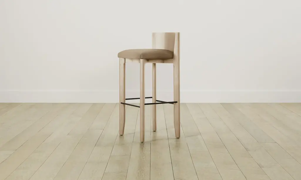 The Delancey Bar & Counter Stool brings depth and dimension into your space with its mixed materiality. Made from ash, it has an elegantly curved back, upholstered seat, and metal footrest. Handcrafted in North Carolina.