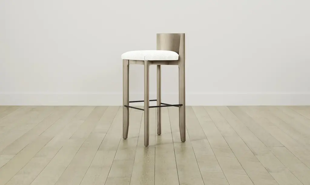 The Delancey Bar & Counter Stool brings depth and dimension into your space with its mixed materiality. Made from ash, it has an elegantly curved back, upholstered seat, and metal footrest. Handcrafted in North Carolina.