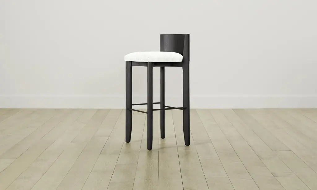 The Delancey Bar & Counter Stool brings depth and dimension into your space with its mixed materiality. Made from ash, it has an elegantly curved back, upholstered seat, and metal footrest. Handcrafted in North Carolina.
