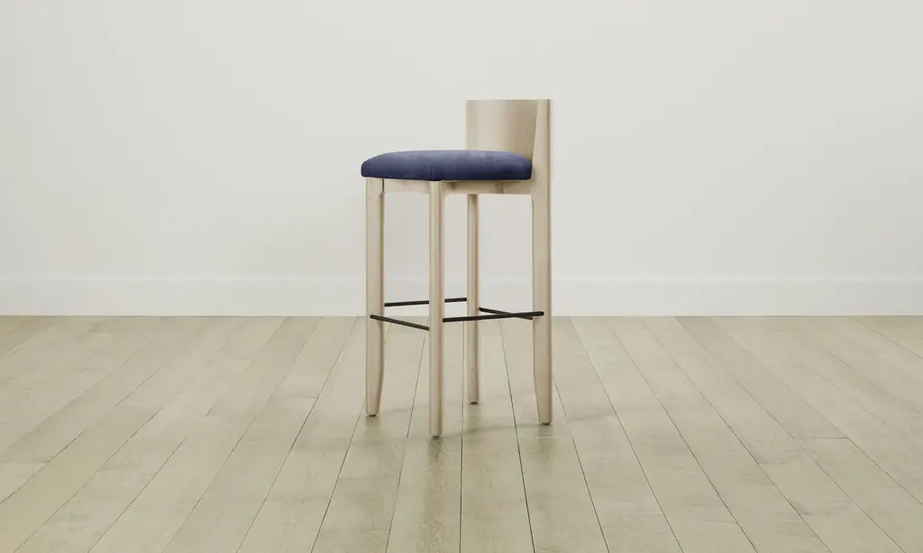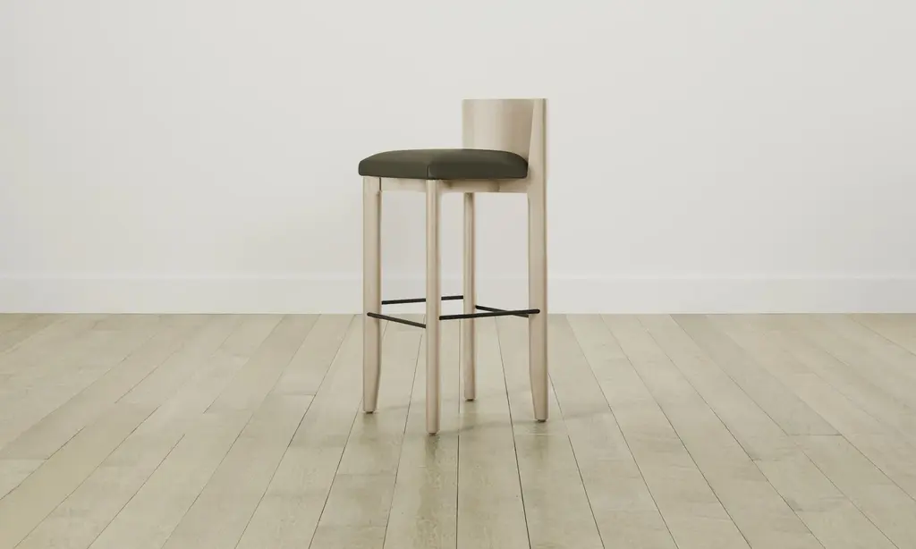The Delancey Bar & Counter Stool brings depth and dimension into your space with its mixed materiality. Made from ash, it has an elegantly curved back, upholstered seat, and metal footrest. Handcrafted in North Carolina.