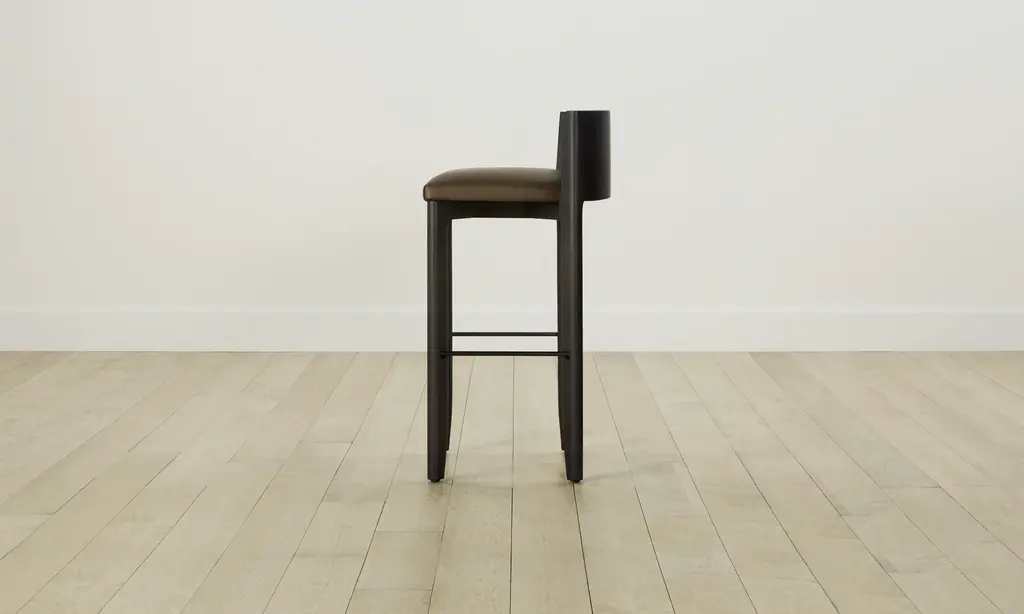 The Delancey Bar & Counter Stool brings depth and dimension into your space with its mixed materiality. Made from ash, it has an elegantly curved back, upholstered seat, and metal footrest. Handcrafted in North Carolina.