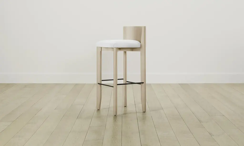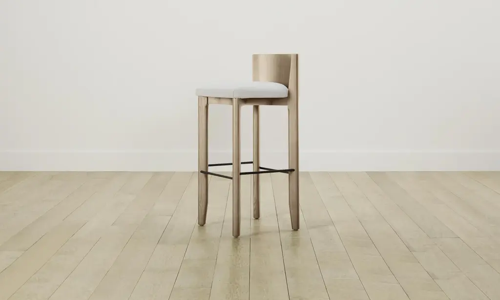 The Delancey Bar & Counter Stool brings depth and dimension into your space with its mixed materiality. Made from ash, it has an elegantly curved back, upholstered seat, and metal footrest. Handcrafted in North Carolina.