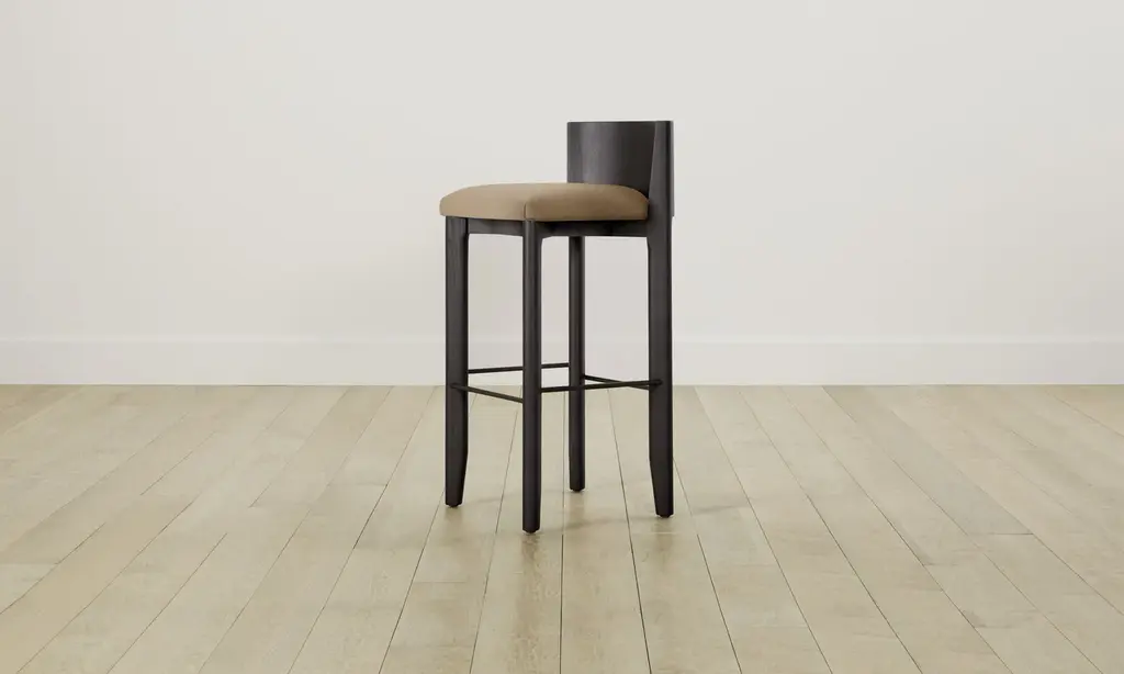The Delancey Bar & Counter Stool brings depth and dimension into your space with its mixed materiality. Made from ash, it has an elegantly curved back, upholstered seat, and metal footrest. Handcrafted in North Carolina.
