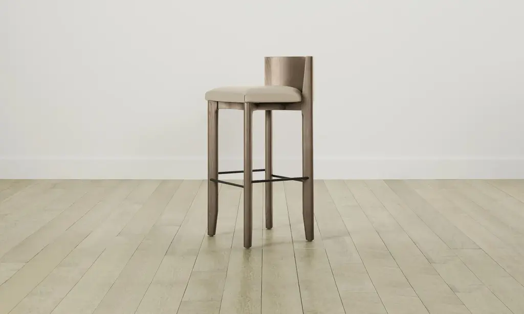 The Delancey Bar & Counter Stool brings depth and dimension into your space with its mixed materiality. Made from ash, it has an elegantly curved back, upholstered seat, and metal footrest. Handcrafted in North Carolina.