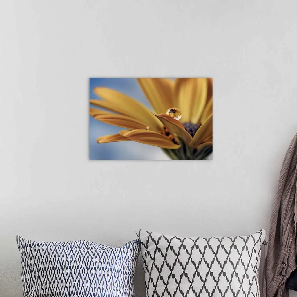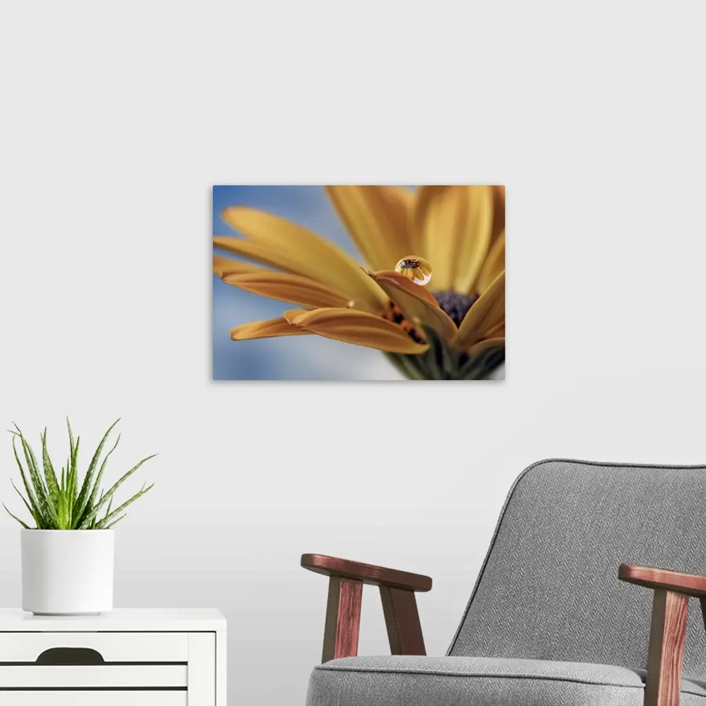 A macro photograph of a water droplet sitting on the edge of a petal of a yellow flower.