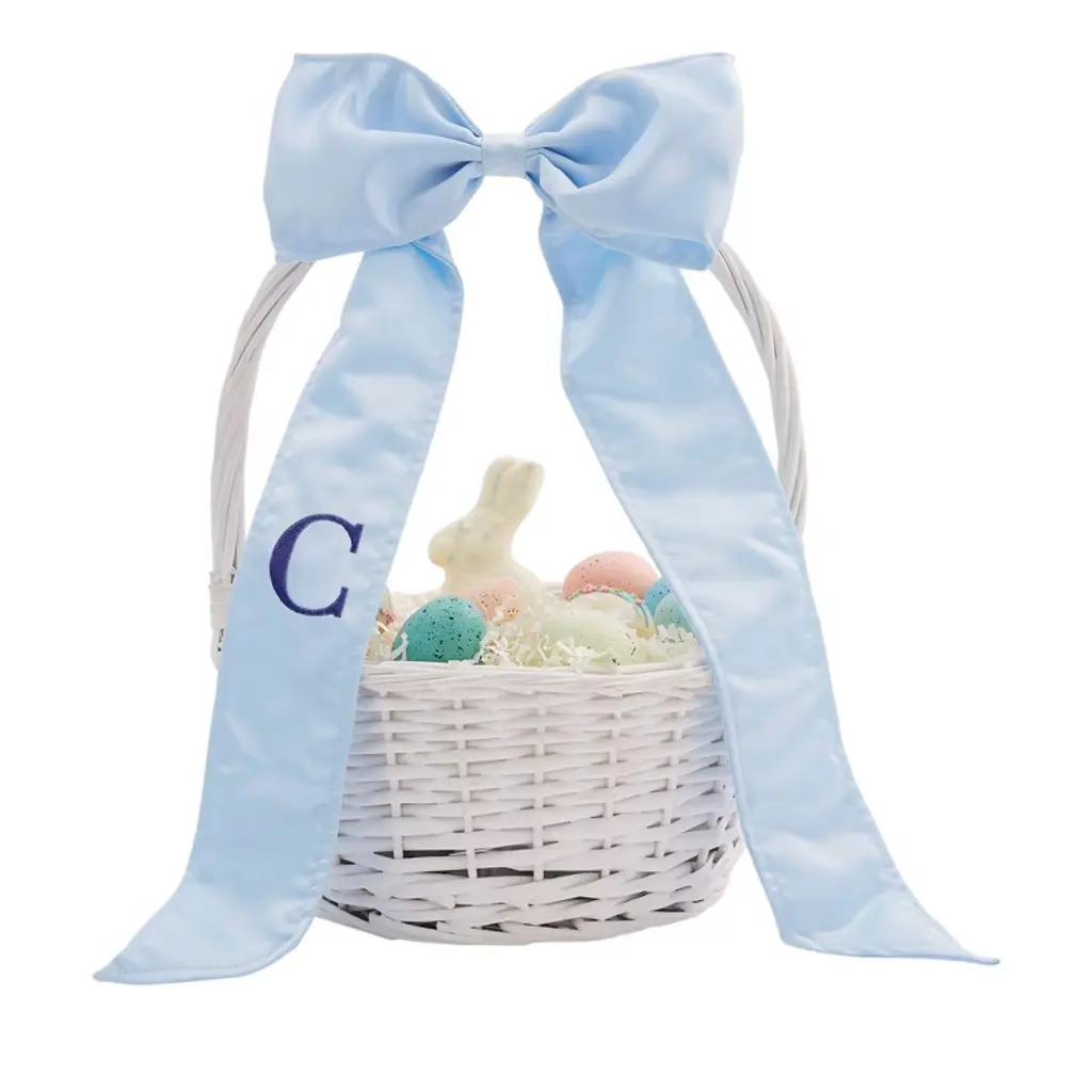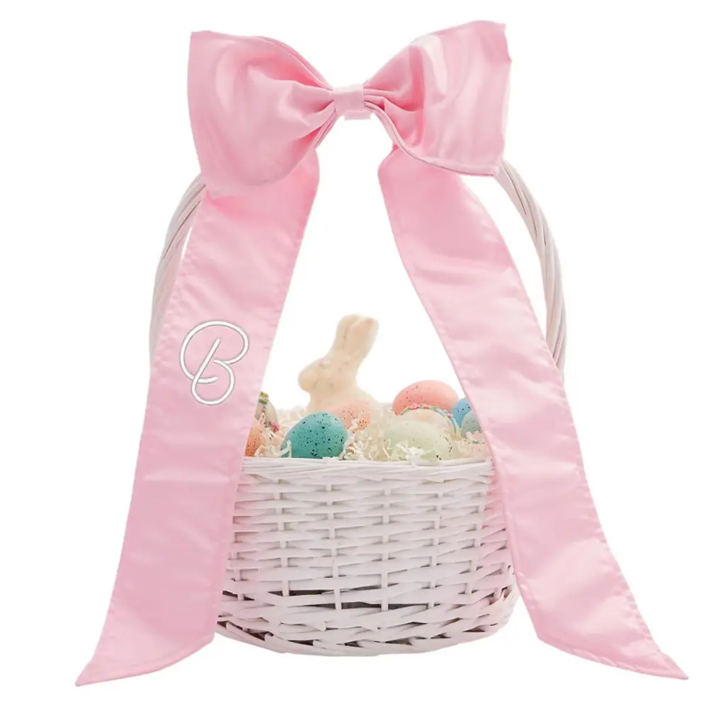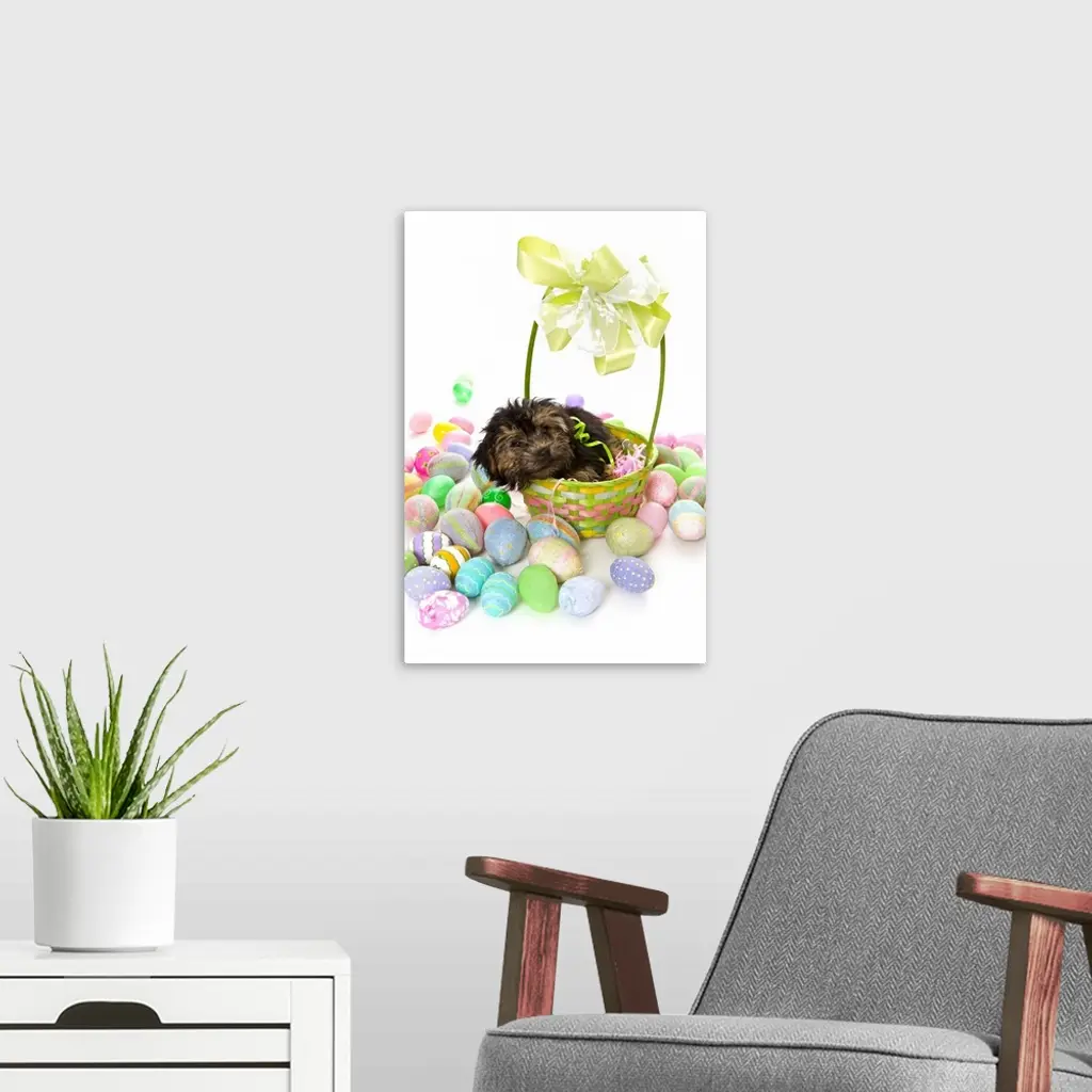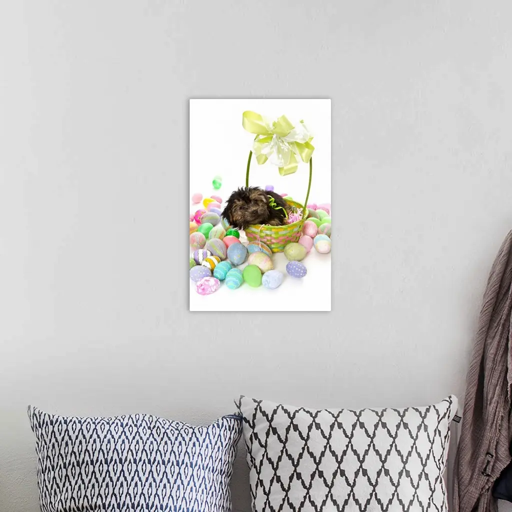 A Yorkie-poo puppy encountering an Easter basket and Easter eggs.
