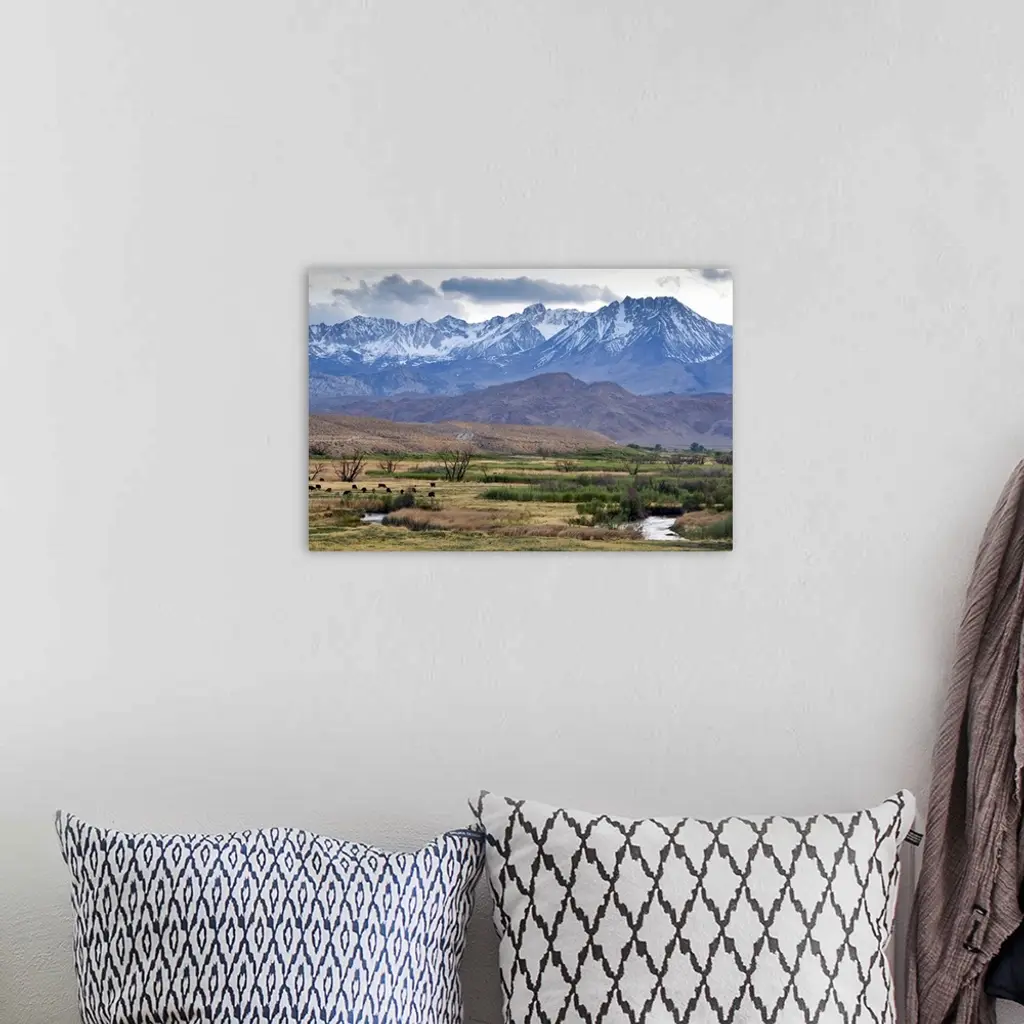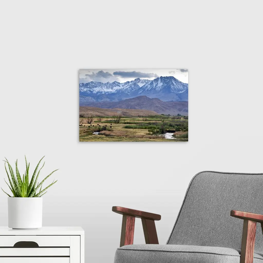 The Eastern Sierra Nevada mountains rise above the Owens River just outside of Bishop, CA.