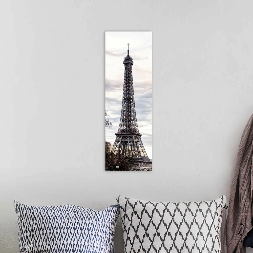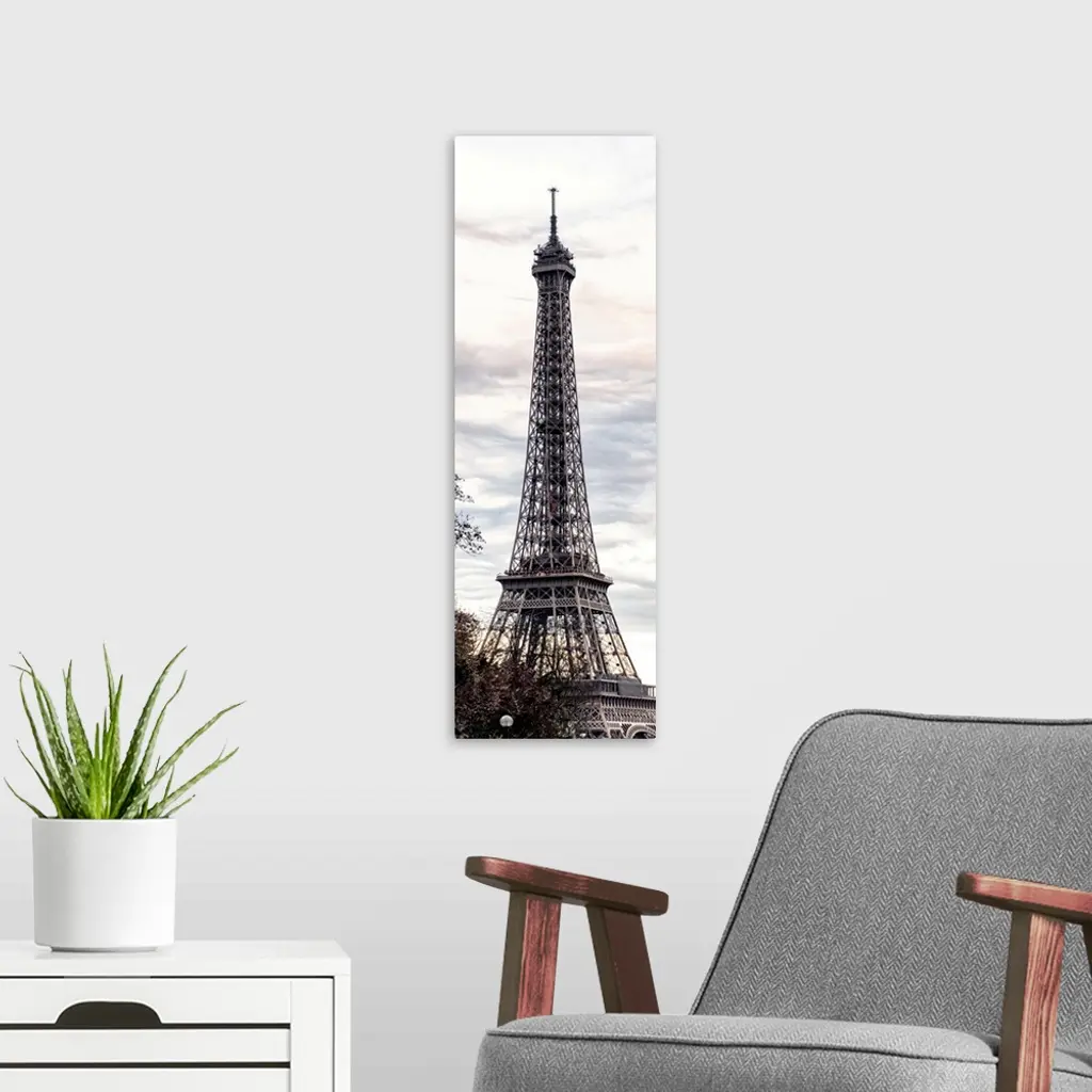 View of the famous Eiffel Tower monument in Paris, France, against an overcast sky.