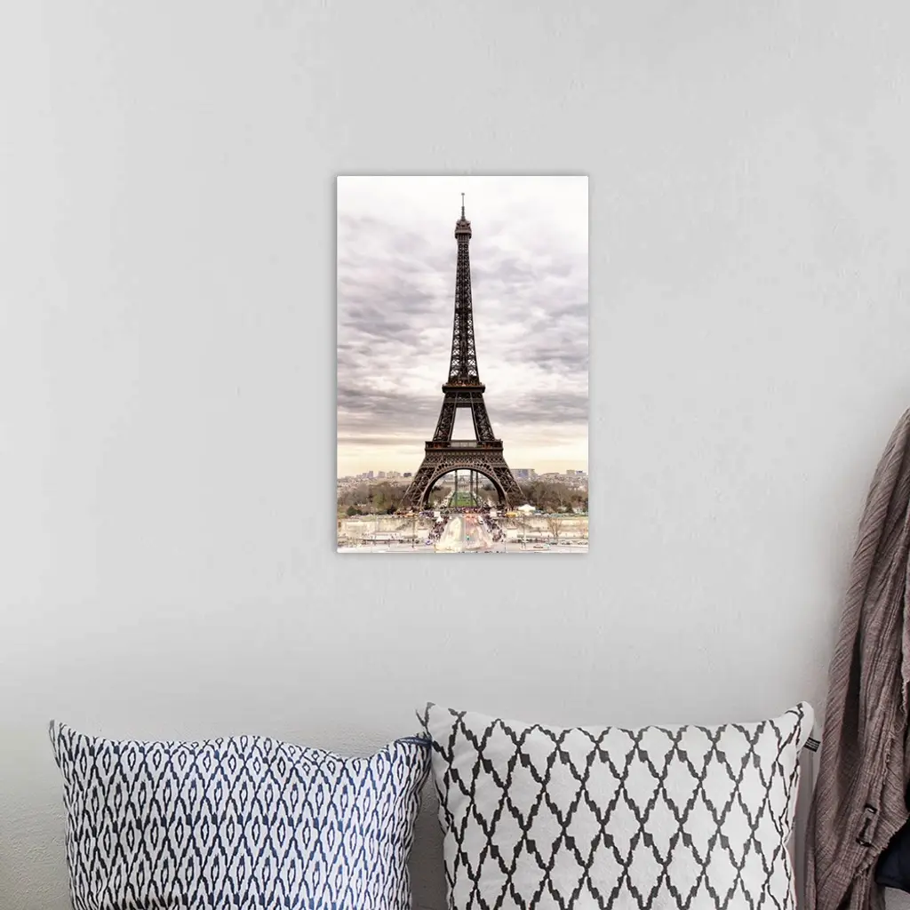 Stunning photograph of the iconic Eiffel Tower in Paris with cloudy skies.