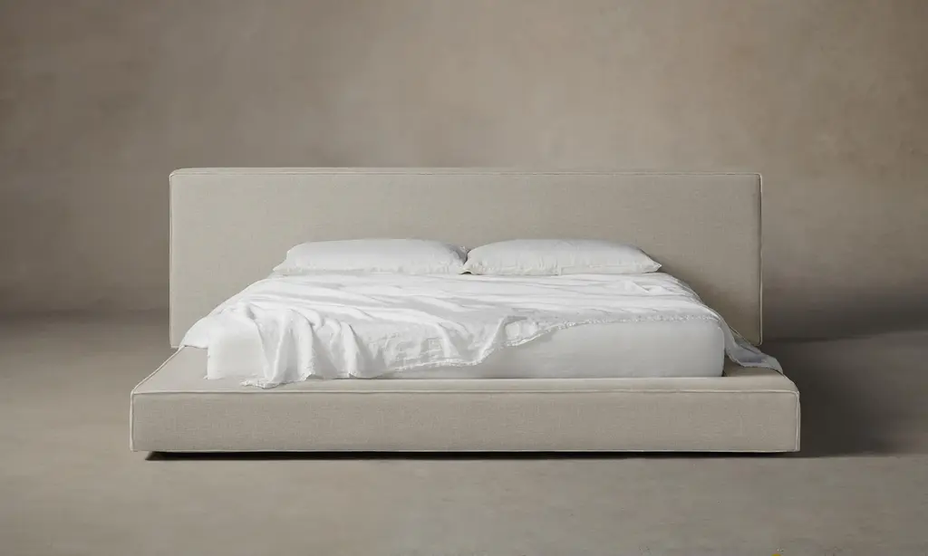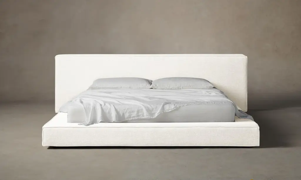 The Eldridge Bed establishes a laid-back ambience in the bedroom with its low-lying silhouette and generous proportions. Fully upholstered and cushioned all around, it has an extended headboard and linear form traced with flange seams. Handcrafted in North Carolina.