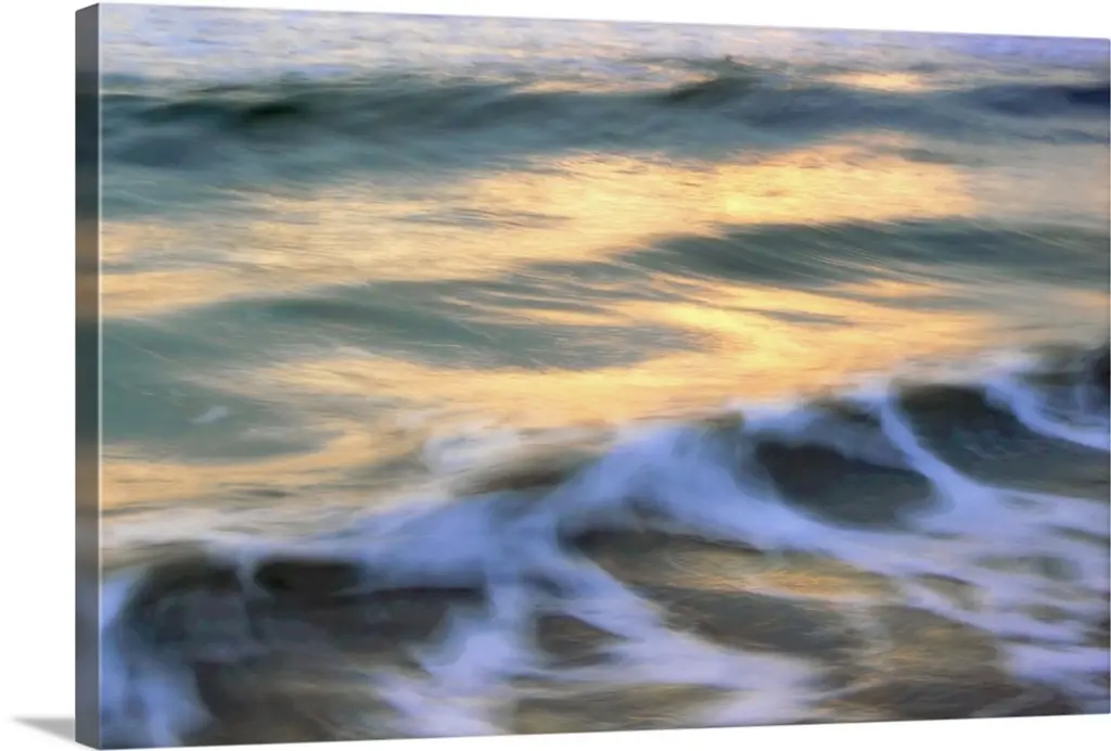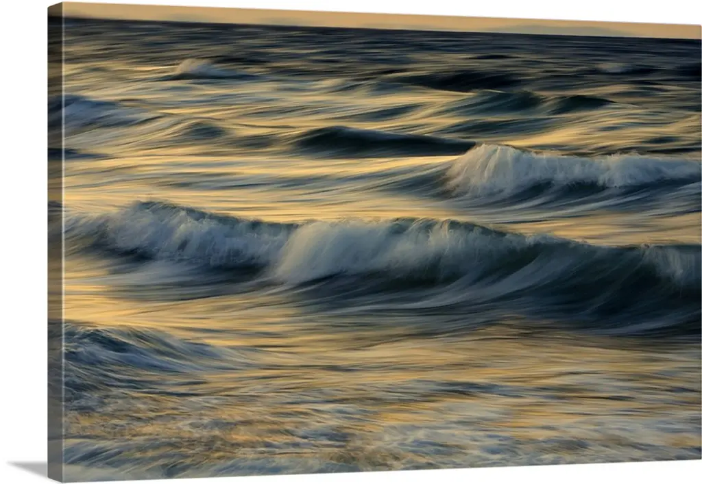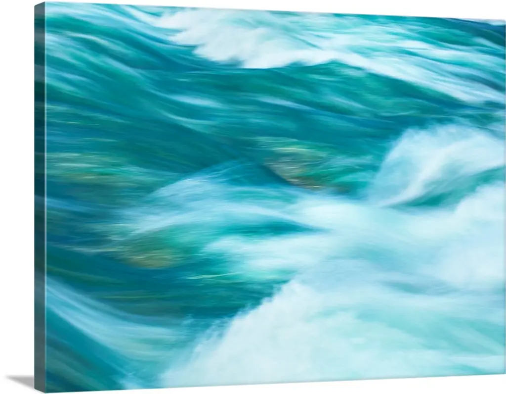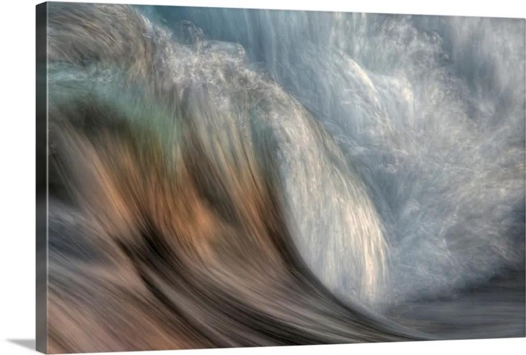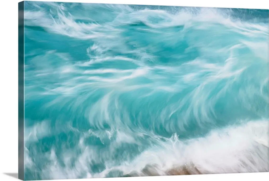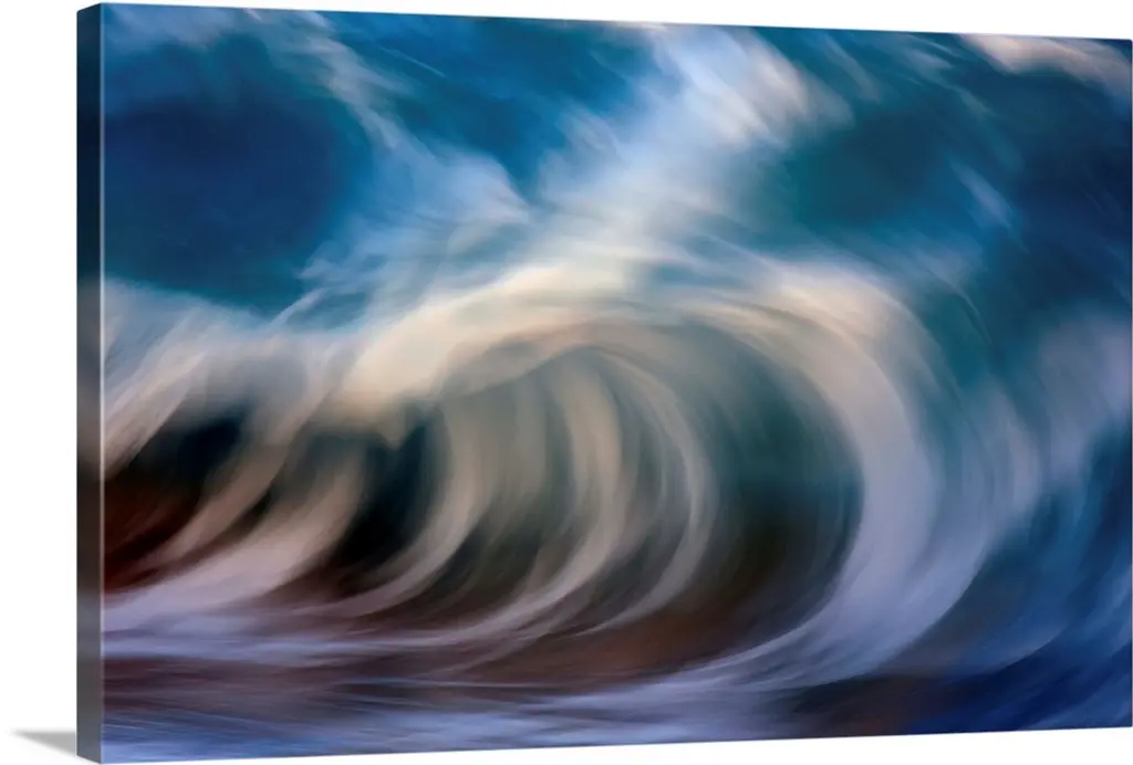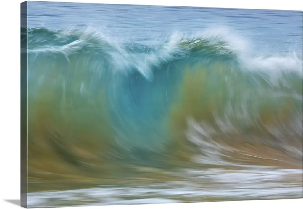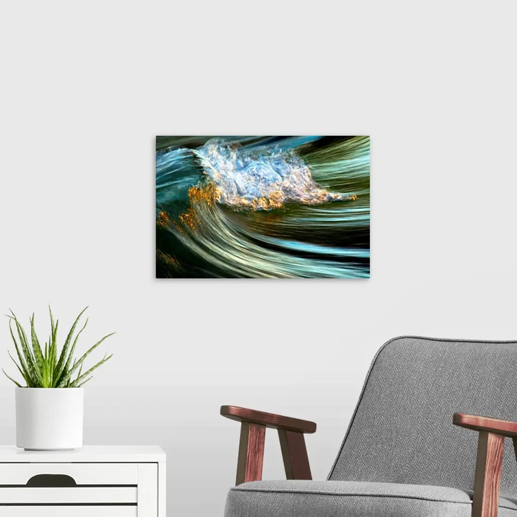 Big photograph focuses on the crest of a wave as it begins to fold over and crash against itself.