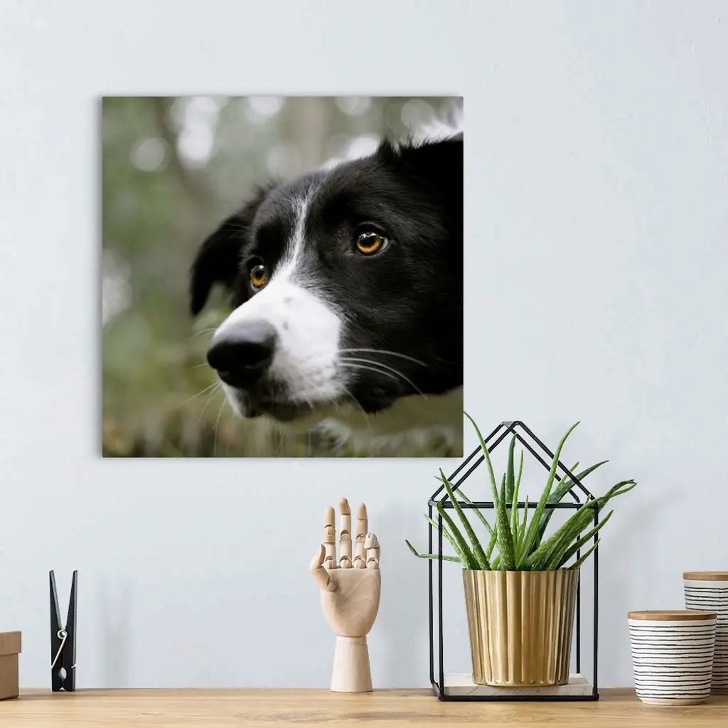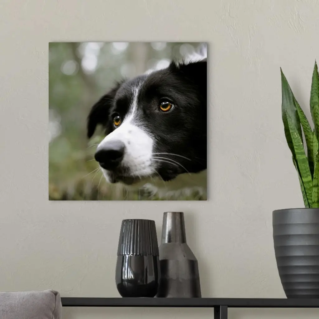 Border Collie dog with beautiful clear eyes showing intense concentration, face filling frame with soft natural background.