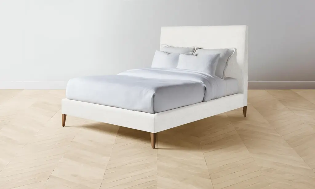 With its clean lines and neat tailoring, the Essex Bed is timeless in the truest sense. It has a fully upholstered frame with mitered corners and rests upon elegantly tapered legs. Handcrafted in North Carolina.