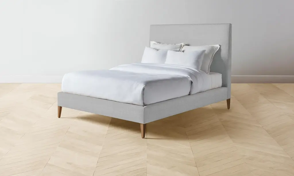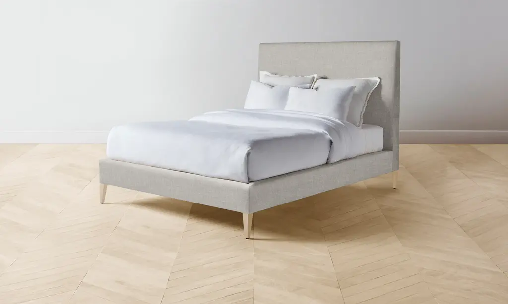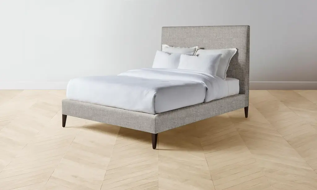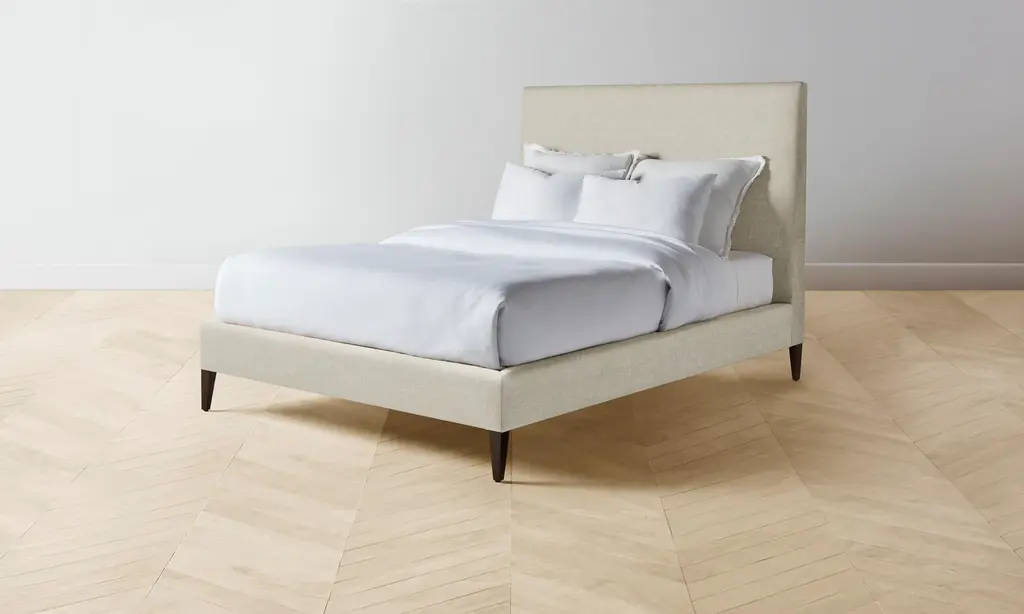 With its clean lines and neat tailoring, the Essex Bed is timeless in the truest sense. It has a fully upholstered frame with mitered corners and rests upon elegantly tapered legs. Handcrafted in North Carolina.