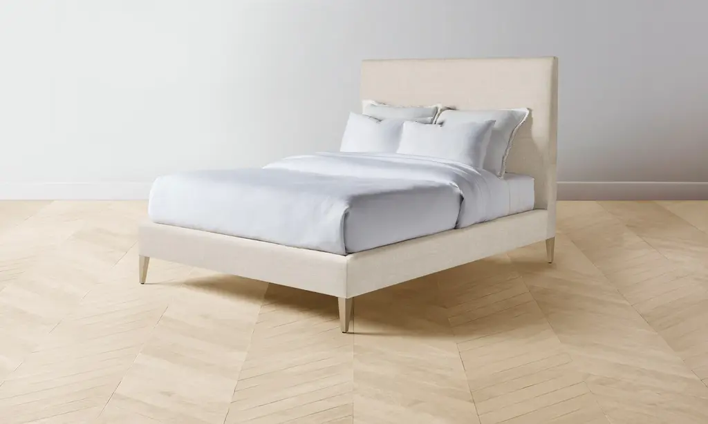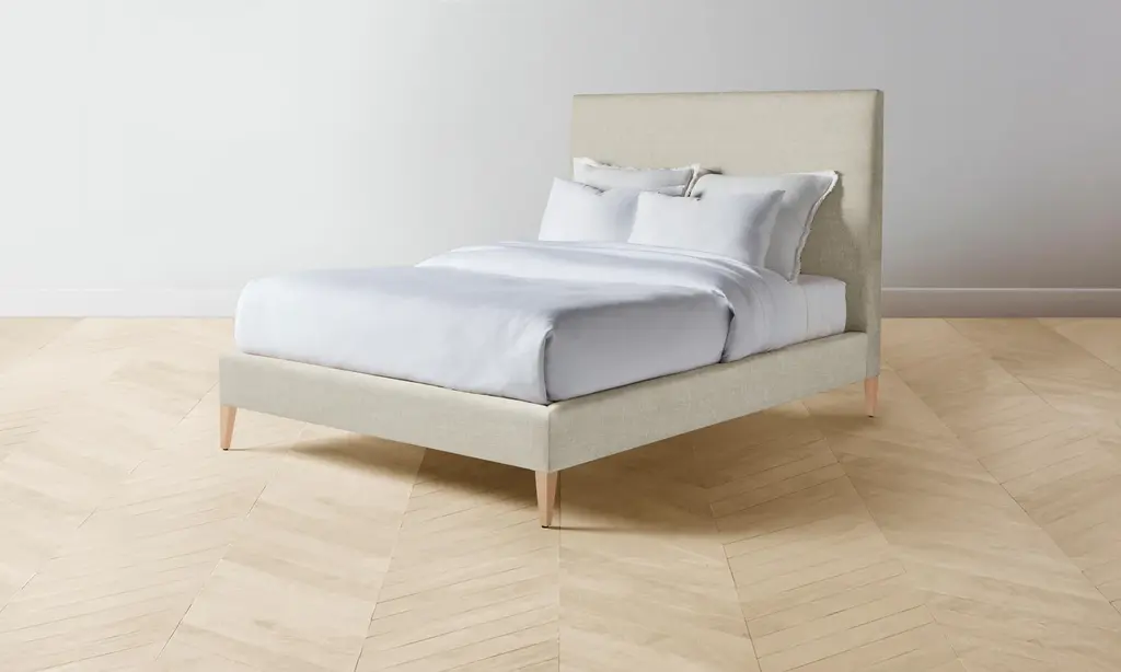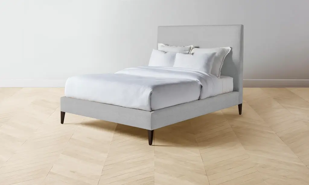 With its clean lines and neat tailoring, the Essex Bed is timeless in the truest sense. It has a fully upholstered frame with mitered corners and rests upon elegantly tapered legs. Handcrafted in North Carolina.