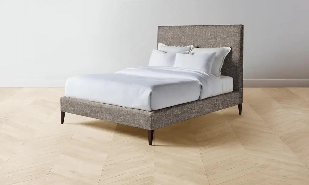With its clean lines and neat tailoring, the Essex Bed is timeless in the truest sense. It has a fully upholstered frame with mitered corners and rests upon elegantly tapered legs. Handcrafted in North Carolina.