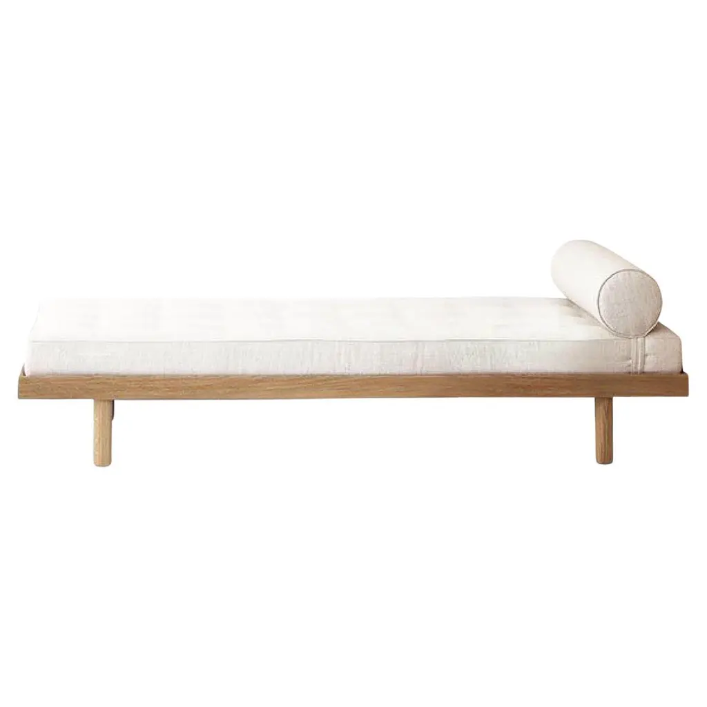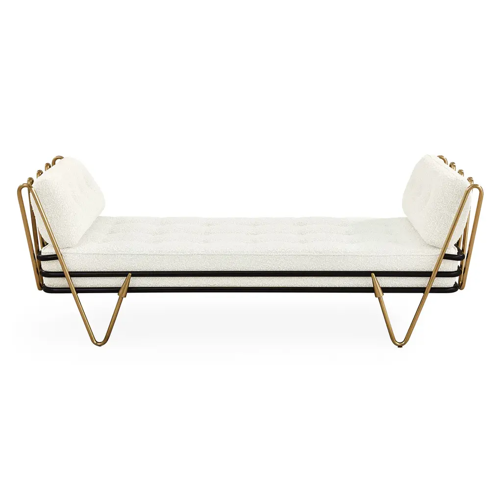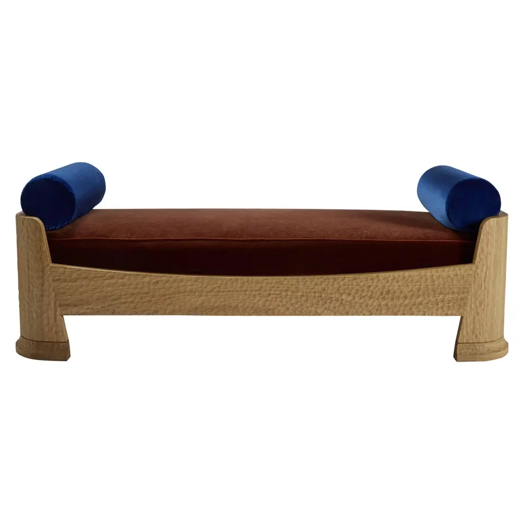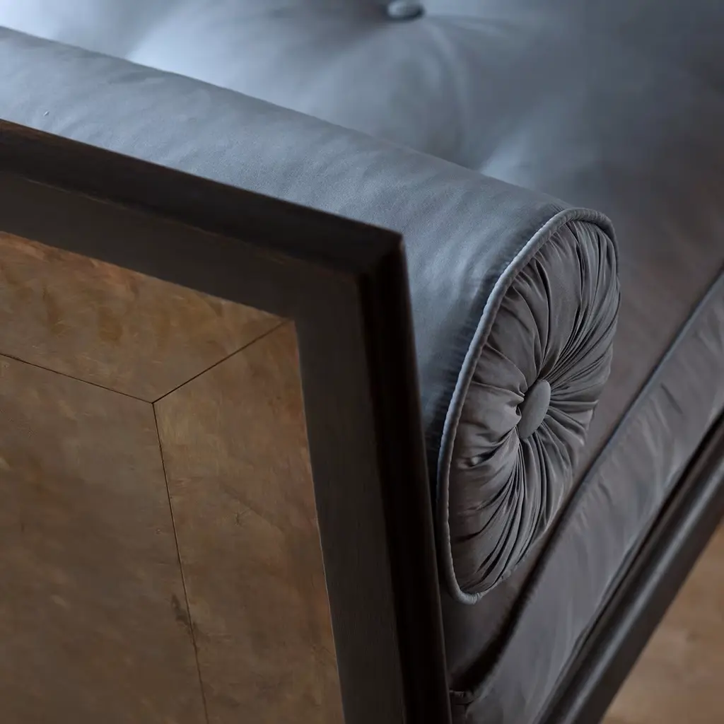 This stunning recamier chair has a retro flair and features two tall ends, silk taffeta upholstery in a delicate wisteria color for the tufted seat and two bolsters. The frame is made of oakwood with an ebonized finish and bronze panels with an antique patina both inside and outside. The construction uses mortise and tenon joints to ensure stability. This piece is a perfect addition near a window to provide a peaceful nest for reading and listening to music.