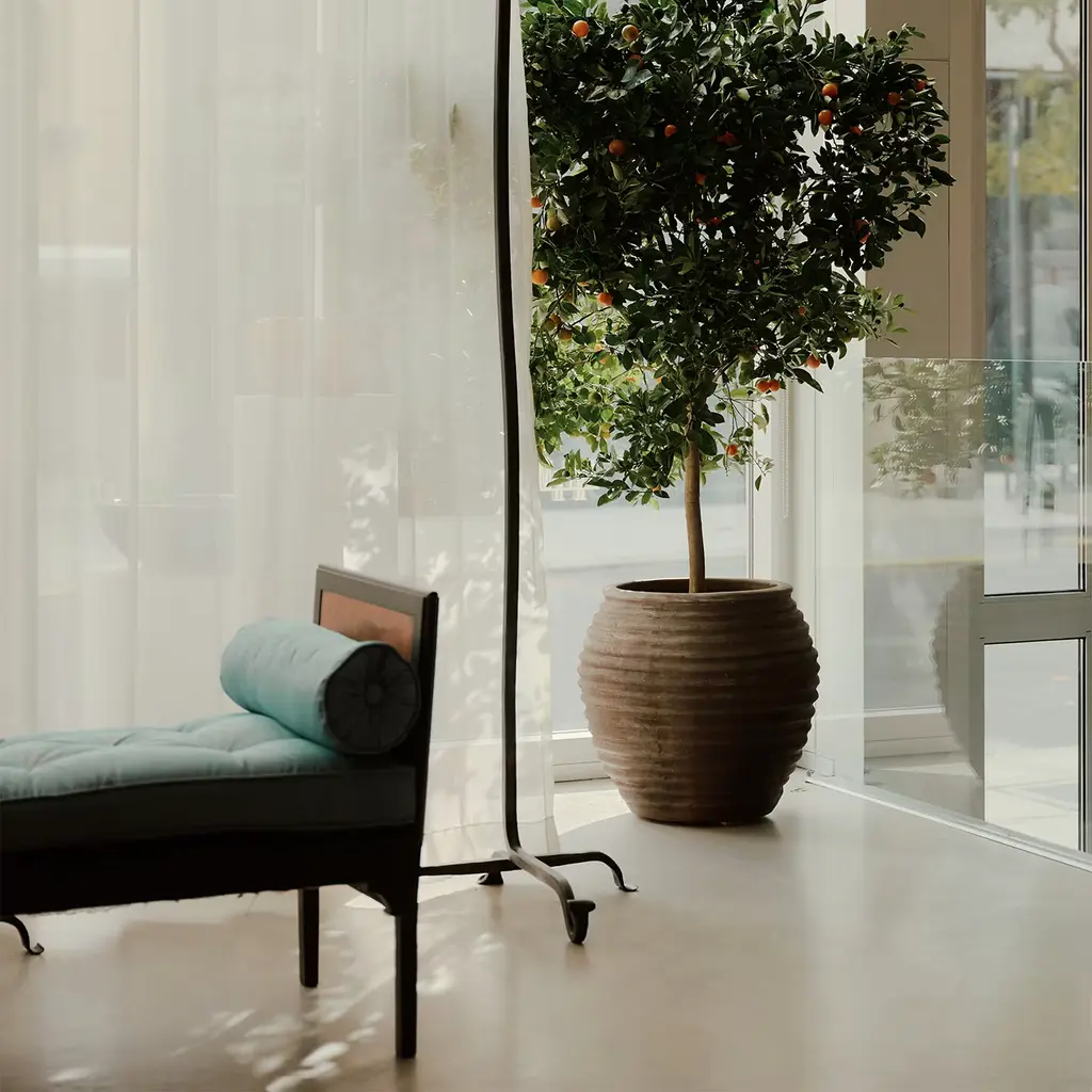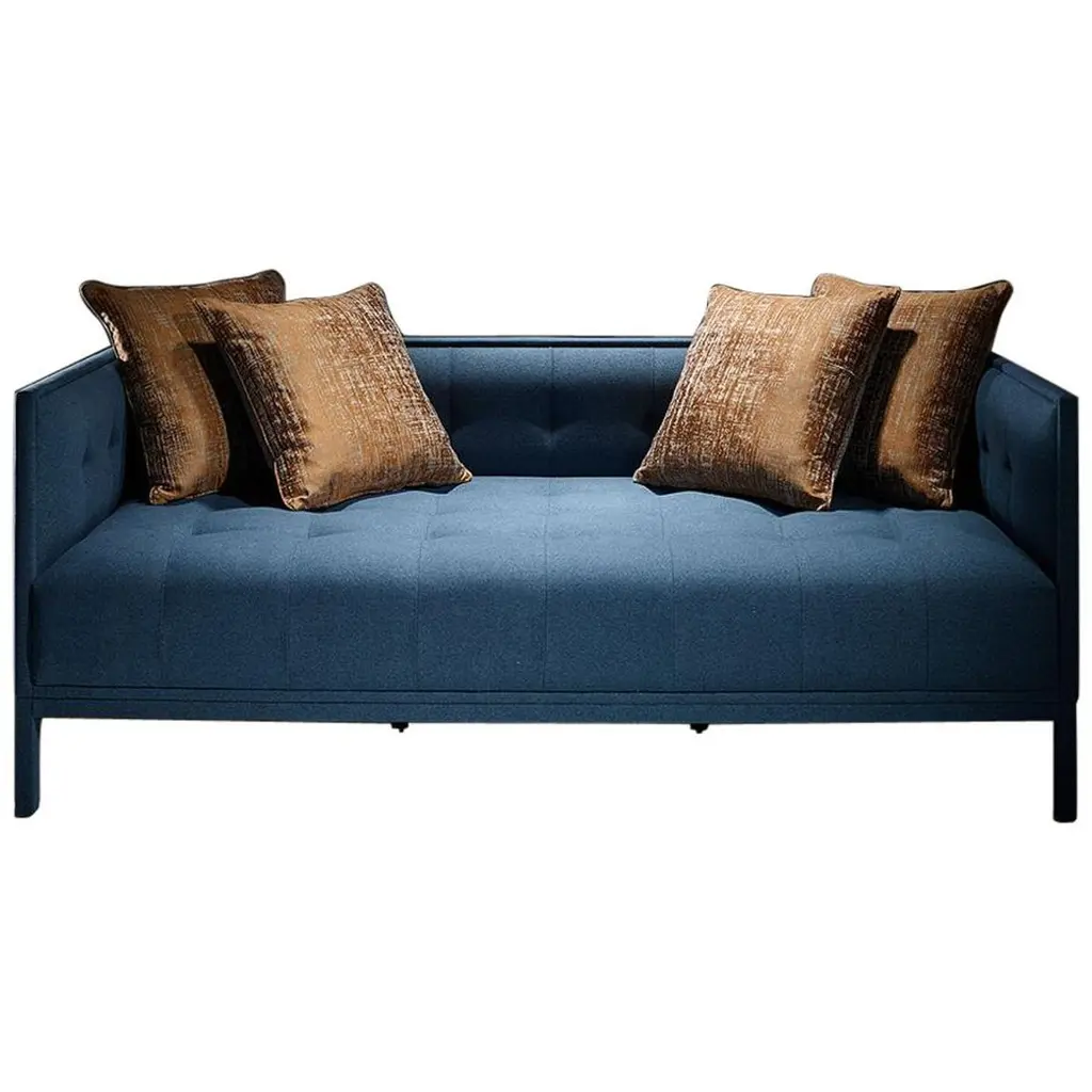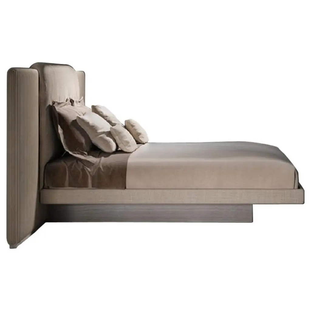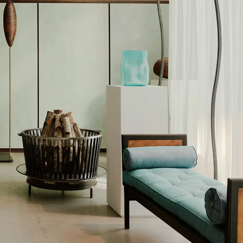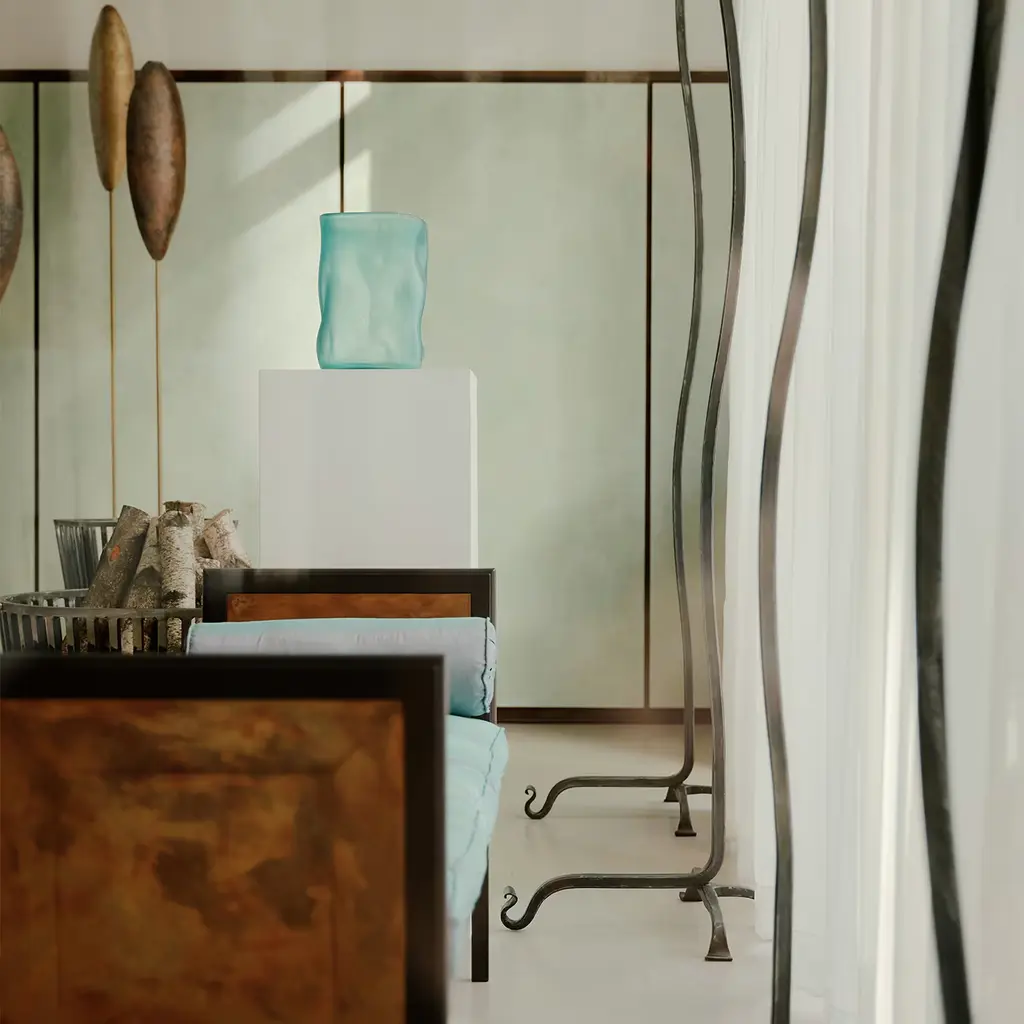 This stunning recamier chair has a retro flair and features two tall ends, silk taffeta upholstery in a delicate wisteria color for the tufted seat and two bolsters. The frame is made of oakwood with an ebonized finish and bronze panels with an antique patina both inside and outside. The construction uses mortise and tenon joints to ensure stability. This piece is a perfect addition near a window to provide a peaceful nest for reading and listening to music.